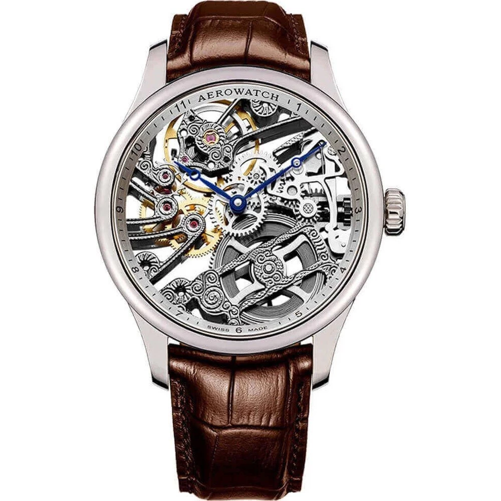 This Aerowatch watch has a case made of stainless steel with a diameter of 43 mm and is fitted with a leather band. Inside the case lies a ETA movement and the watch features a Sapphire crystal.