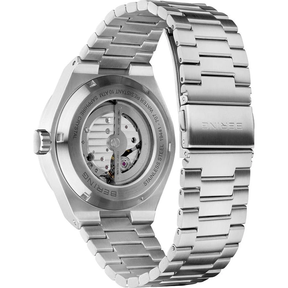 This Bering watch has a case made of stainless steel with a diameter of 41 mm and is fitted with a metal band. Inside the case lies a Miyota movement and the watch features a Sapphire crystal.