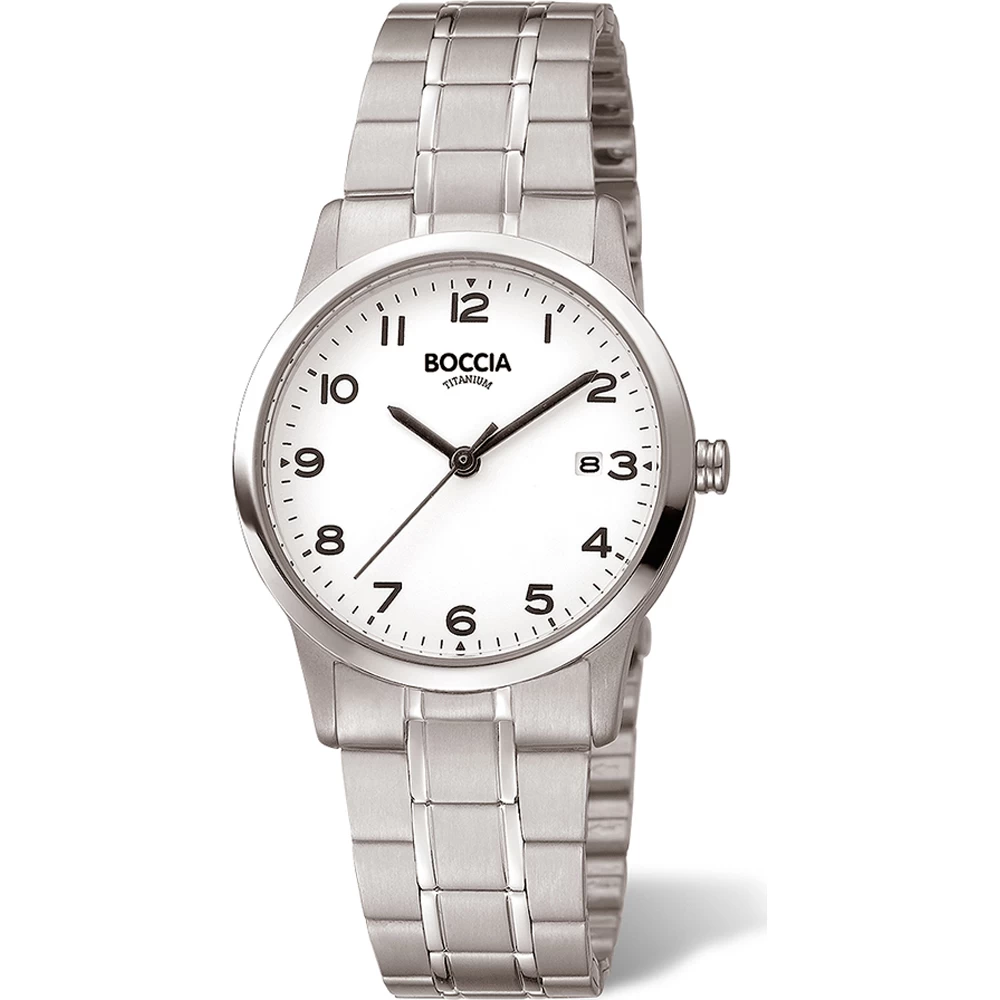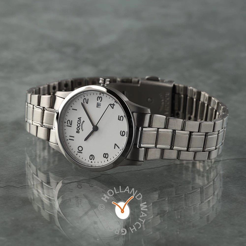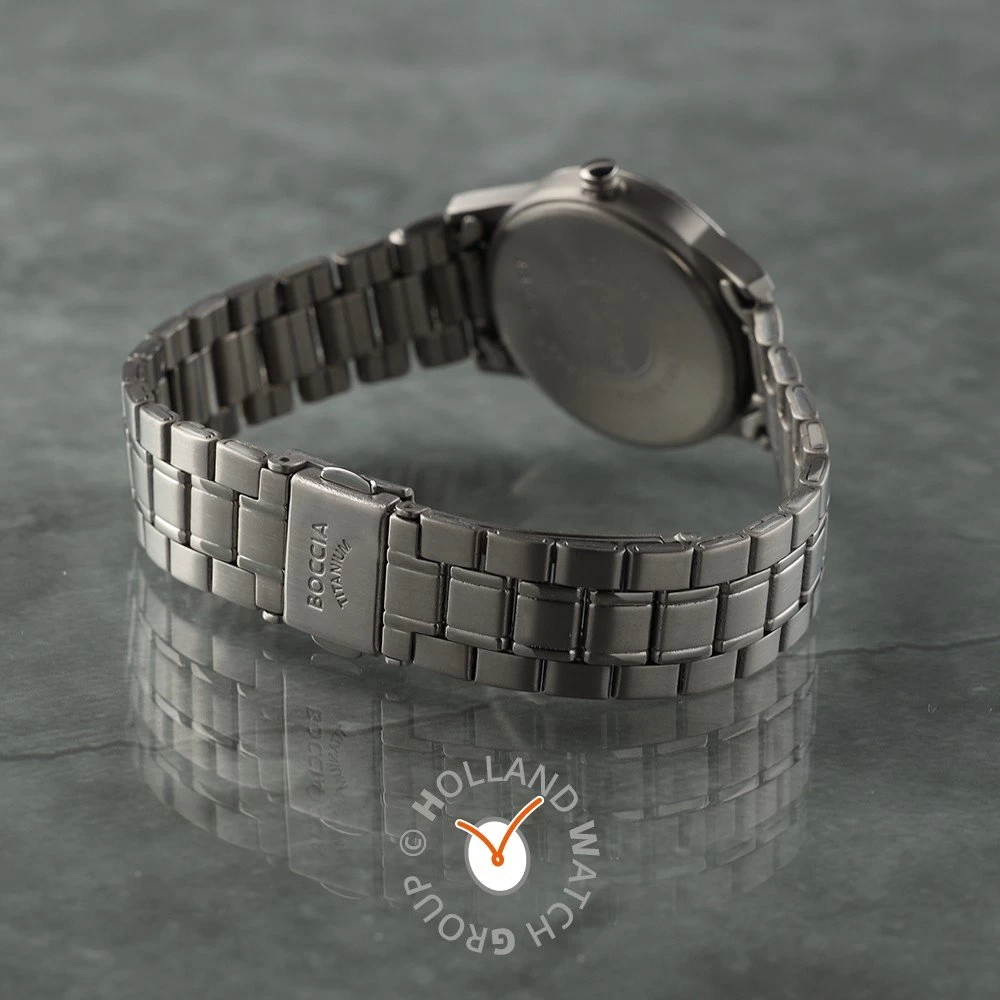 This Boccia watch has a case made of titanium with a diameter of 29 mm and is fitted with a titanium band. Inside the case lies a Miyota movement and the watch features a Mineral crystal.