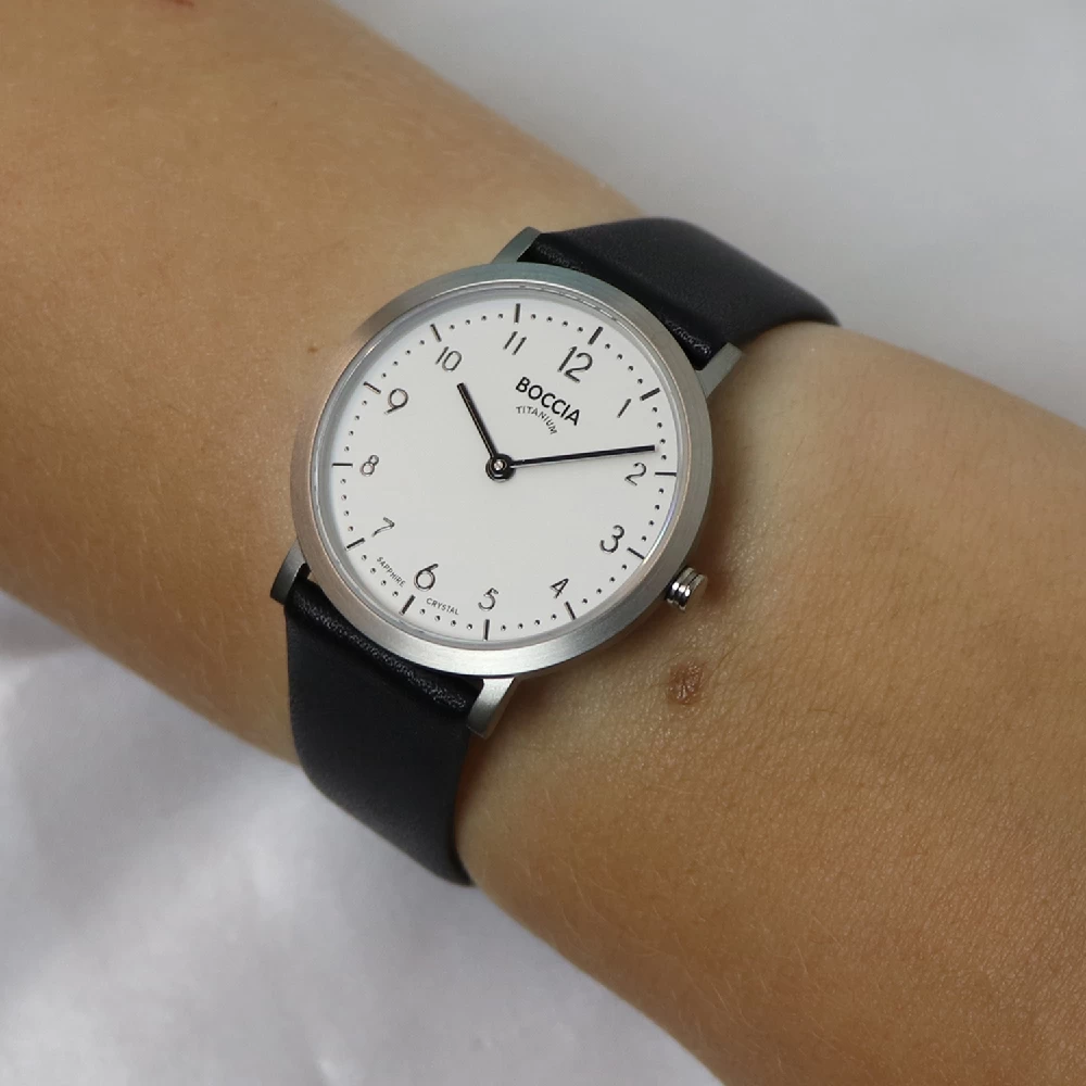 This Boccia watch has a case made of titanium with a diameter of 34 mm and is fitted with a leather band. Inside the case lies a Miyota movement and the watch features a Sapphire crystal.
