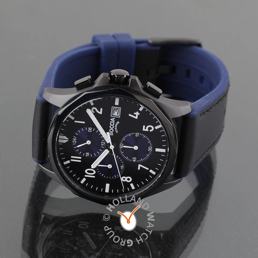 This Boccia watch has a case made of titanium with a diameter of 40 mm and is fitted with a leather band. Inside the case lies a Miyota movement and the watch features a Mineral crystal.