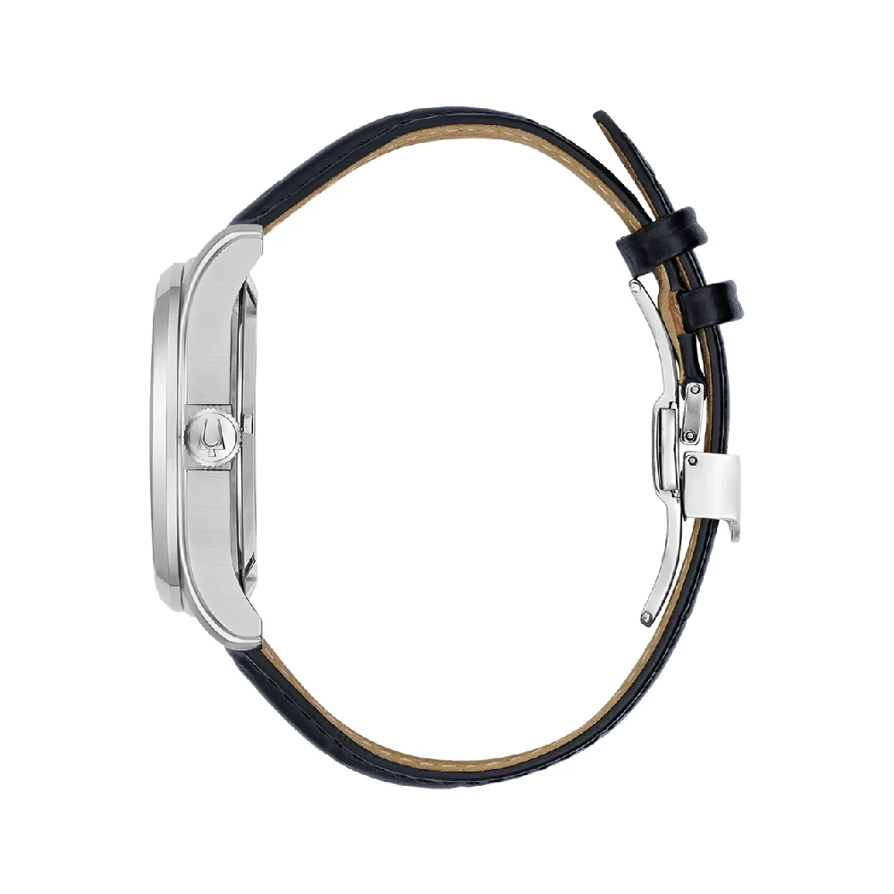 This Bulova watch has a case made of stainless steel with a diameter of 43 mm and is fitted with a leather band. Inside the case lies a Miyota movement and the watch features a Sapphire crystal.