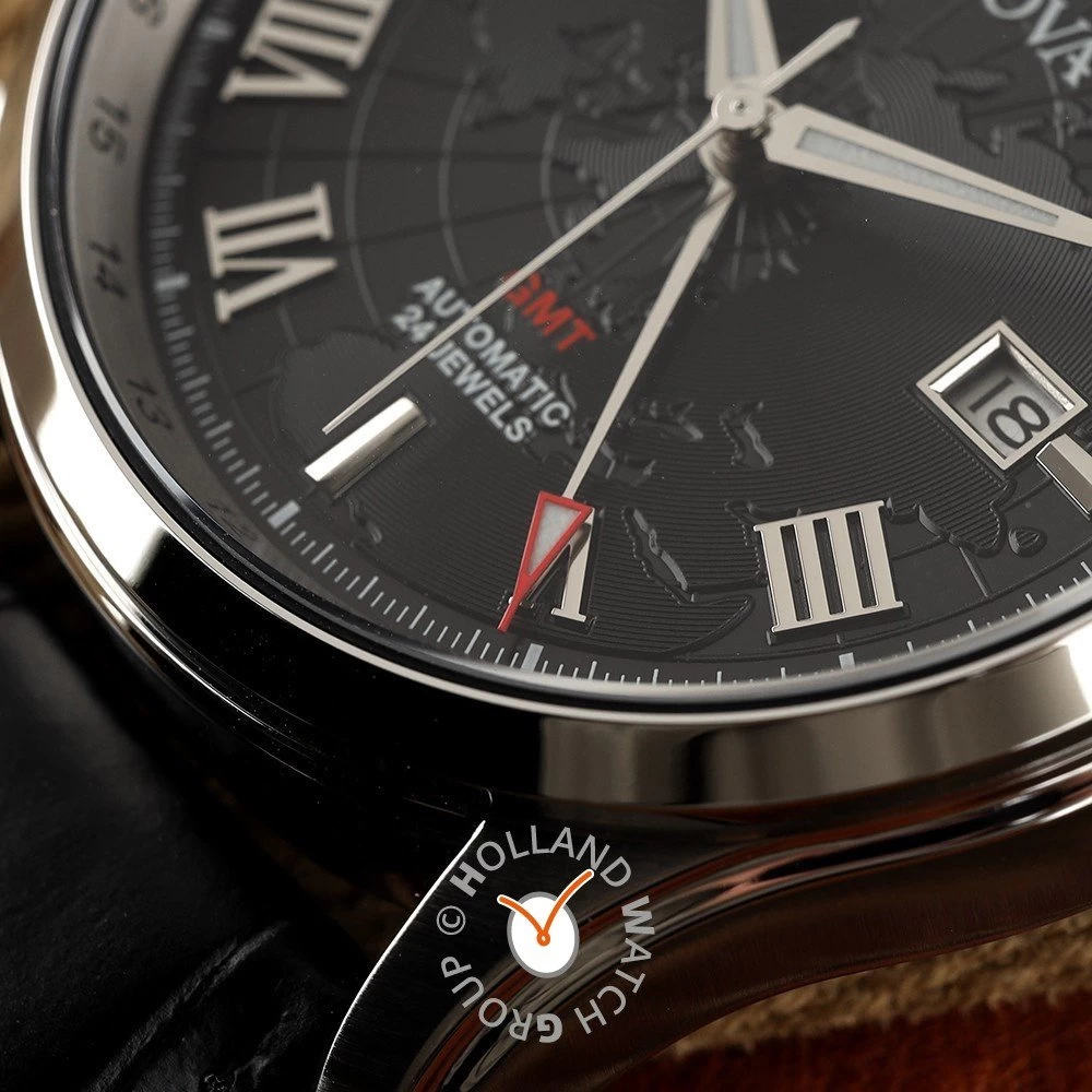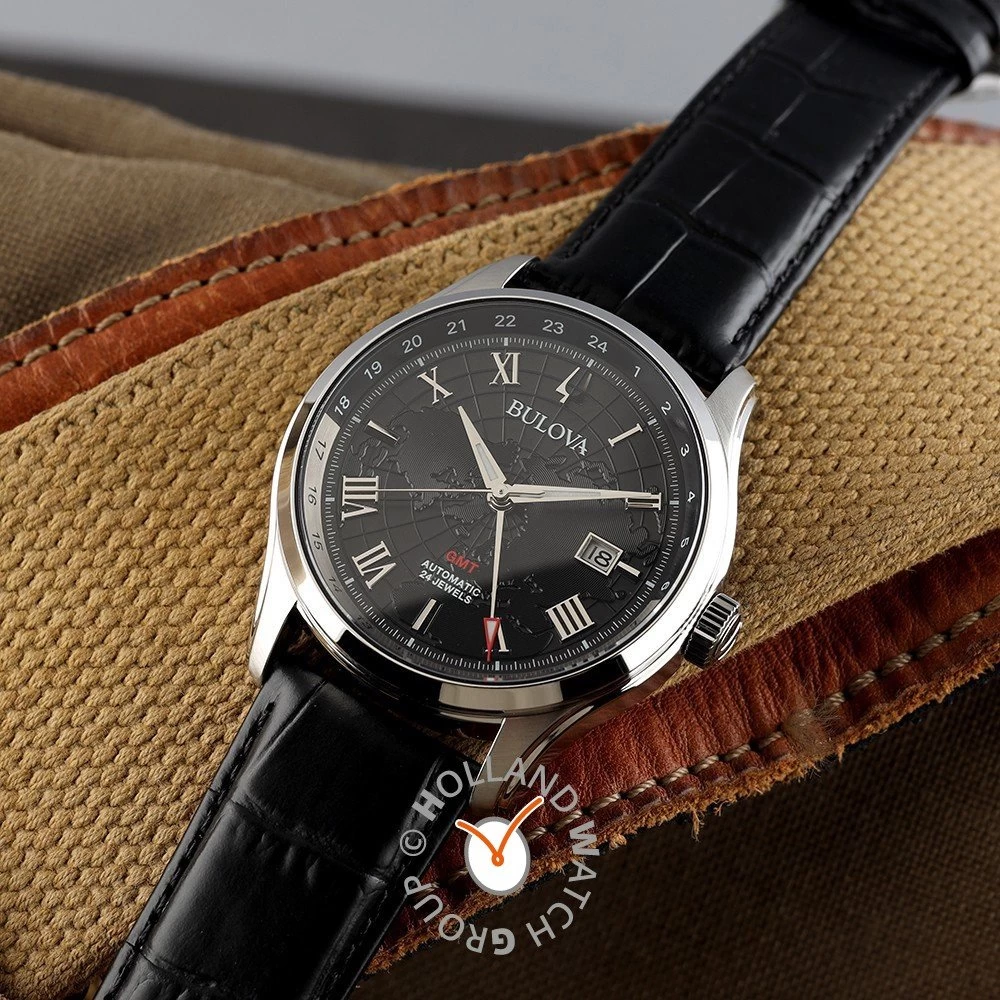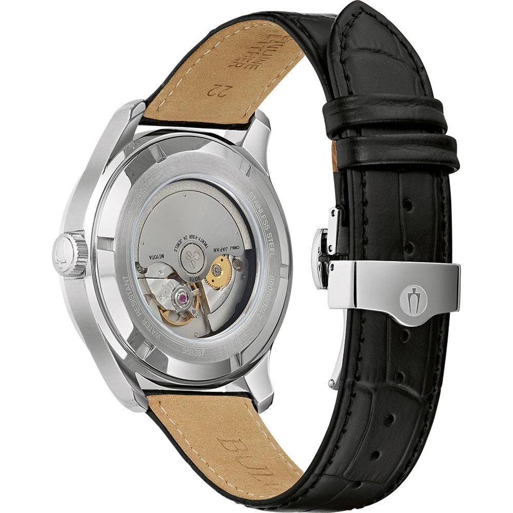 This Bulova watch has a case made of stainless steel with a diameter of 43 mm and is fitted with a leather band. Inside the case lies a Miyota movement and the watch features a Sapphire crystal.