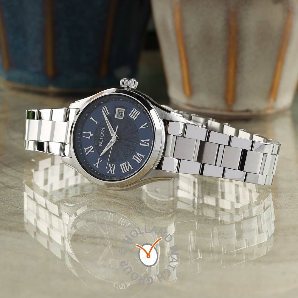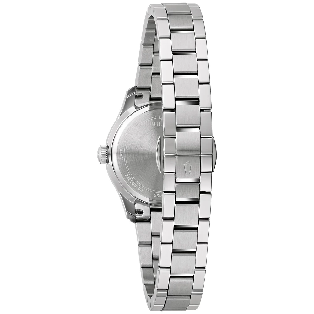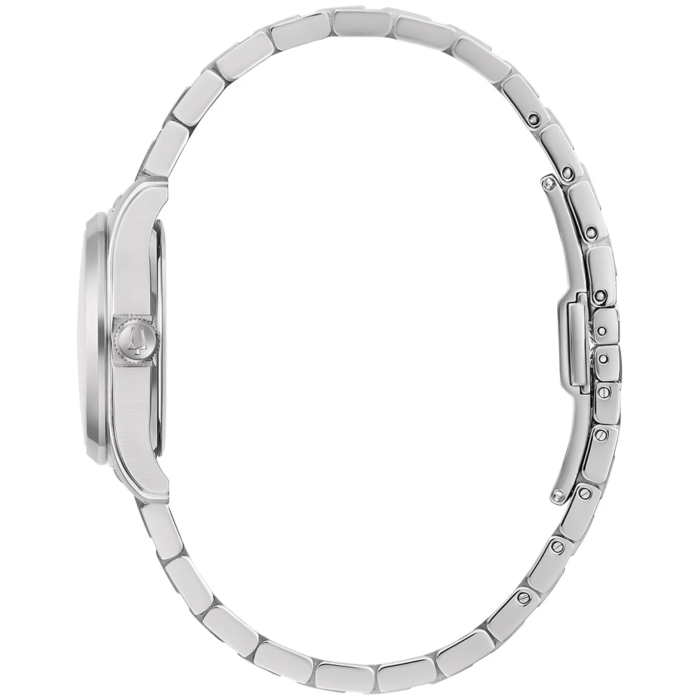 This Bulova watch has a case made of stainless steel with a diameter of 29 mm and is fitted with a metal band. Inside the case lies a Miyota movement and the watch features a Mineral crystal.