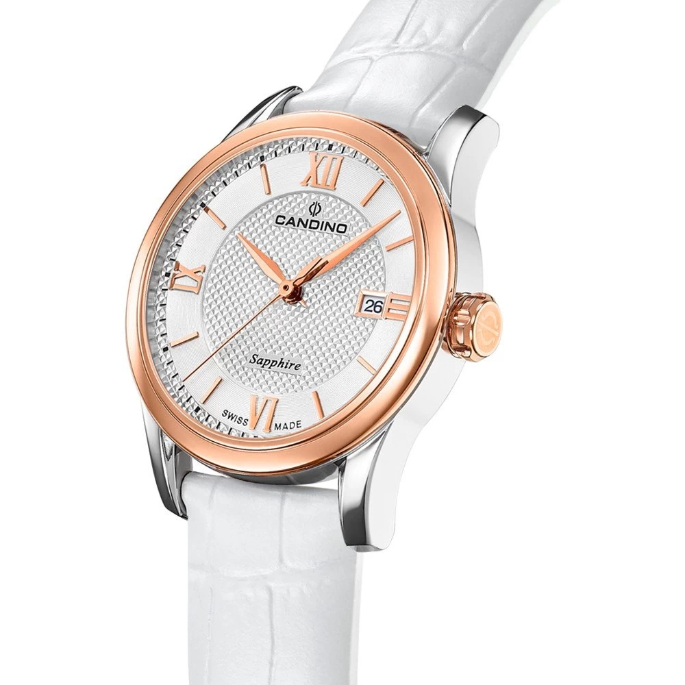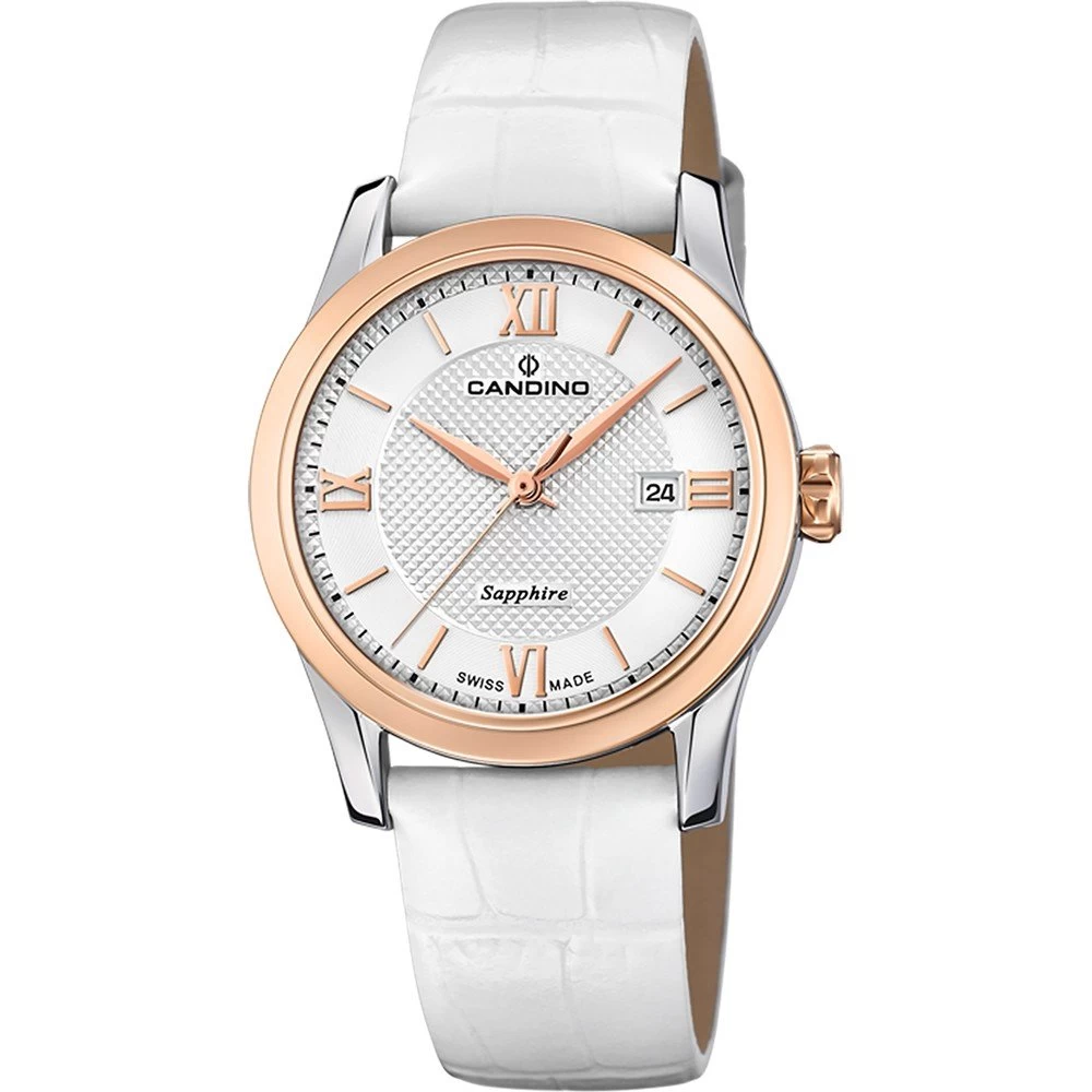 This Candino watch has a case made of stainless steel with a diameter of 33 mm and is fitted with a leather band. Inside the case lies a Ronda movement and the watch features a Sapphire crystal.