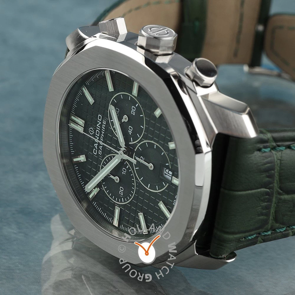 This Candino watch has a case made of stainless steel with a diameter of 44 mm and is fitted with a leather band. Inside the case lies a Ronda movement and the watch features a Sapphire crystal.