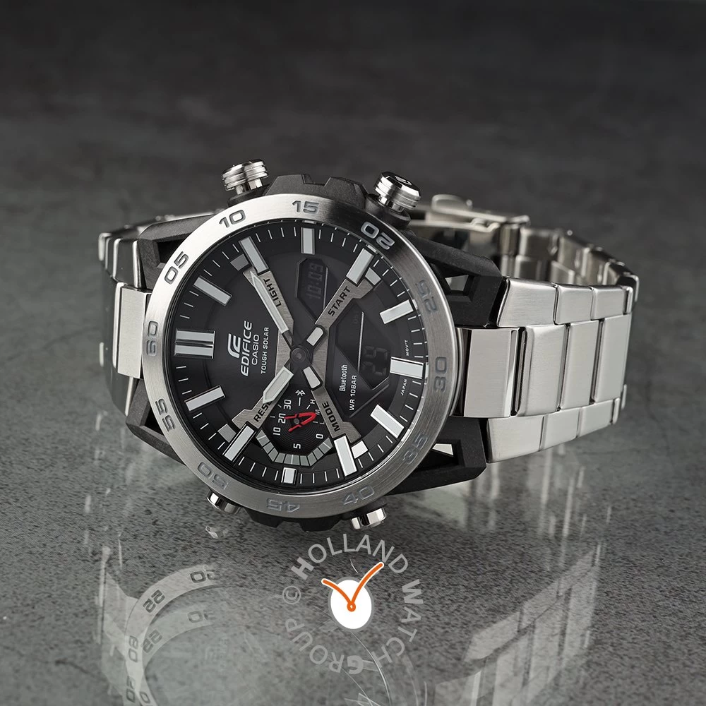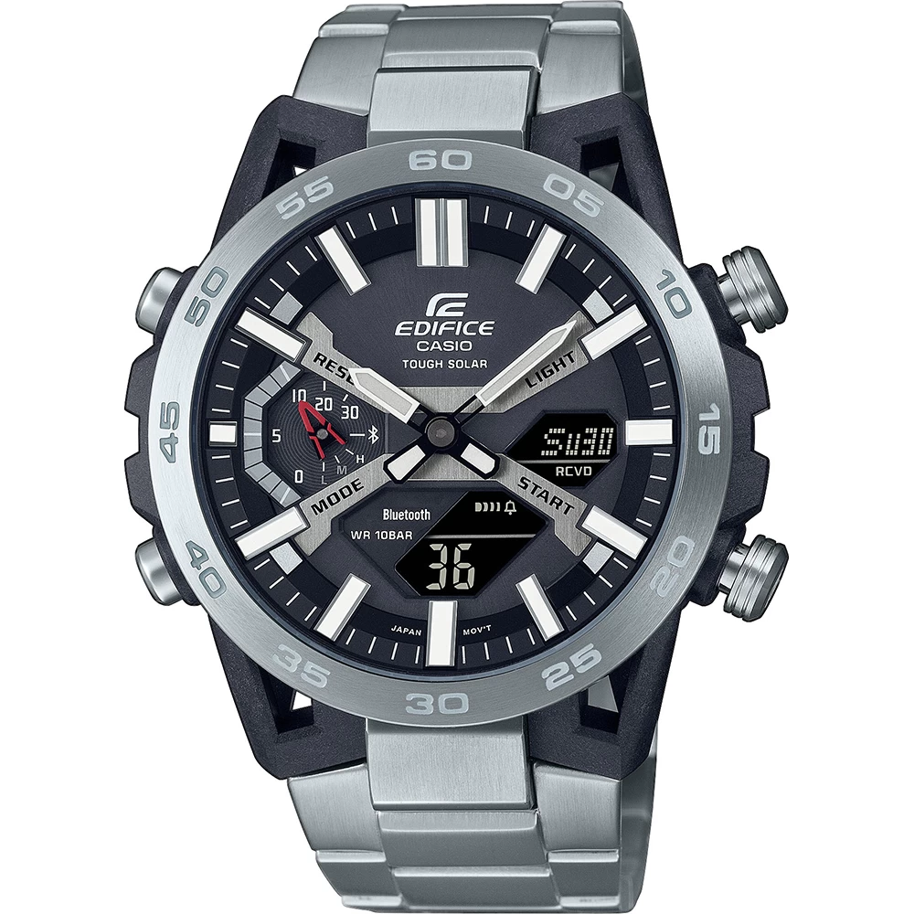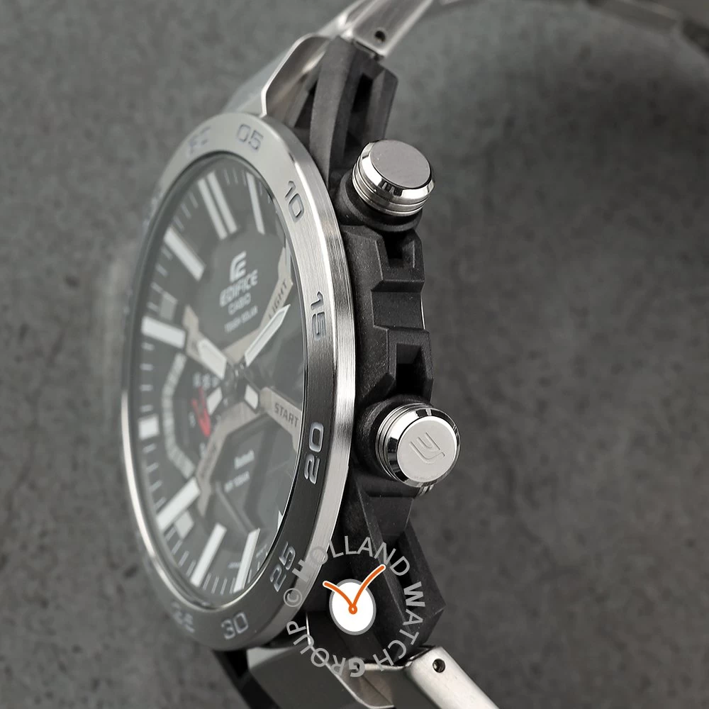 This Casio Edifice watch has a case made of carbon with a diameter of 48 mm and is fitted with a metal band. Inside the case lies a Casio movement and the watch features a Mineral crystal.