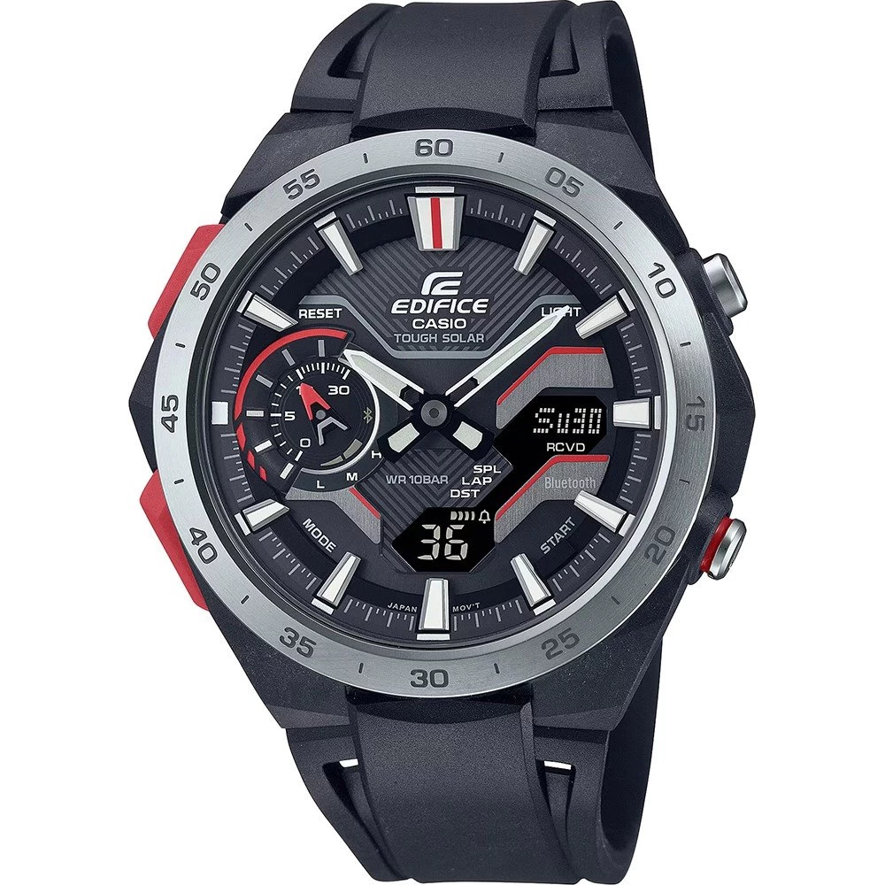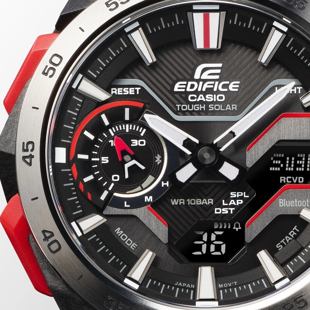 The design of the ECB-2200 is inspired by the air flow around a race car. The unique exterior is made up of an an intricately moulded case constructed of composite parts and a sharp, dimensional mechanical face, with a look of sheer speed. The chronograph features Smartphone Link connectivity and Tough Solar charging.