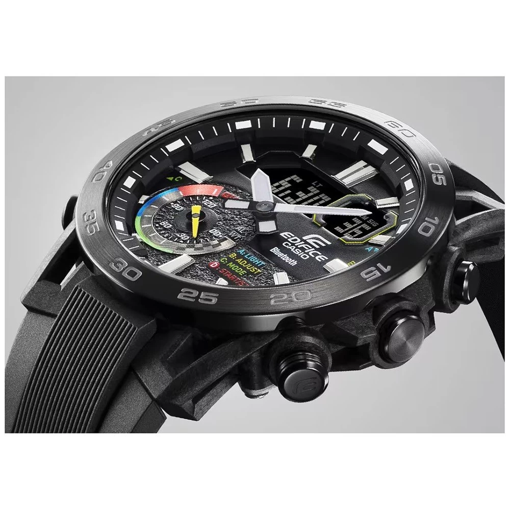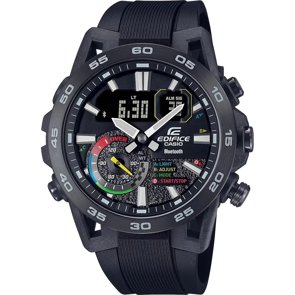 This Casio Edifice watch has a case made of Carbon reinforced resin with a diameter of 46 mm and is fitted with a plastic / resin band. Inside the case lies a Casio movement and the watch features a Mineral crystal.