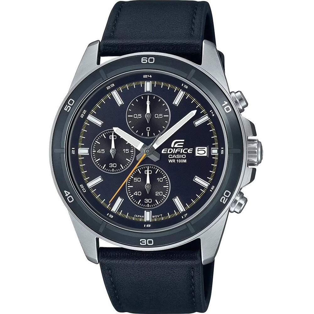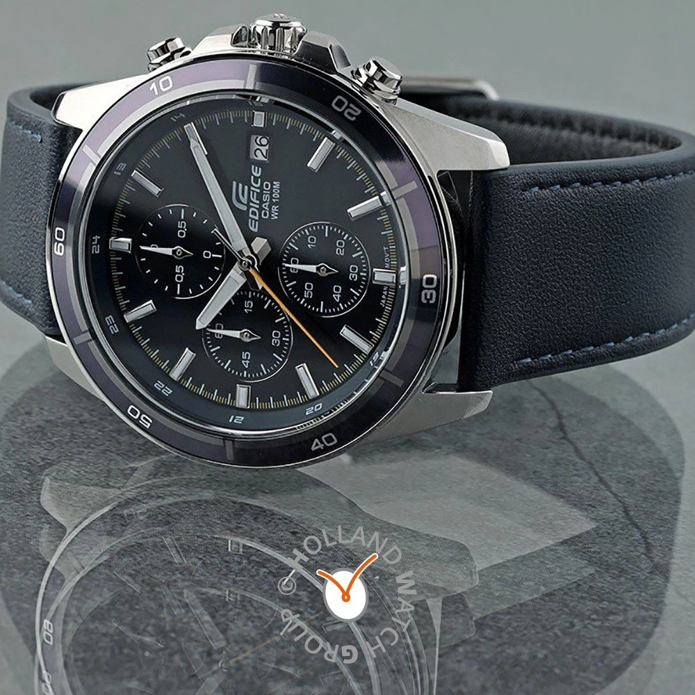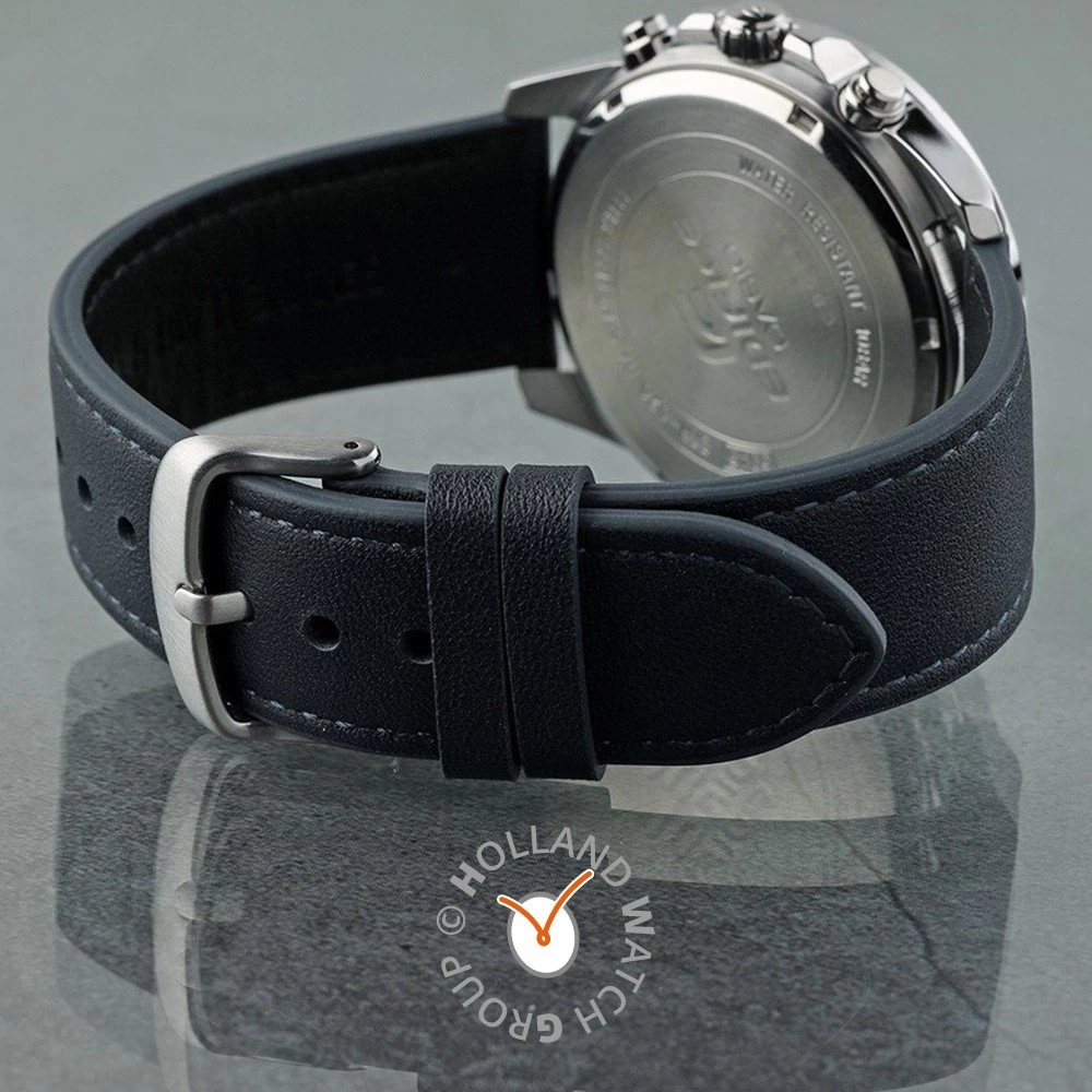 This Casio Edifice watch has a case made of stainless steel with a diameter of 43.8 mm and is fitted with a leather band. Inside the case lies a Casio movement and the watch features a Mineral crystal.