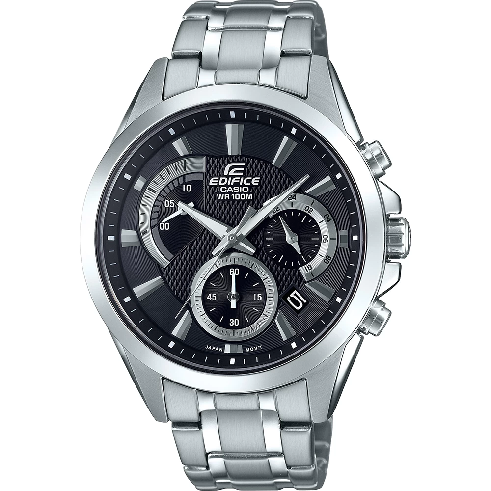 This Casio Edifice watch has a case made of stainless steel with a diameter of 43.8 mm and is fitted with a metal band. Inside the case lies a Casio movement and the watch features a Mineral crystal.