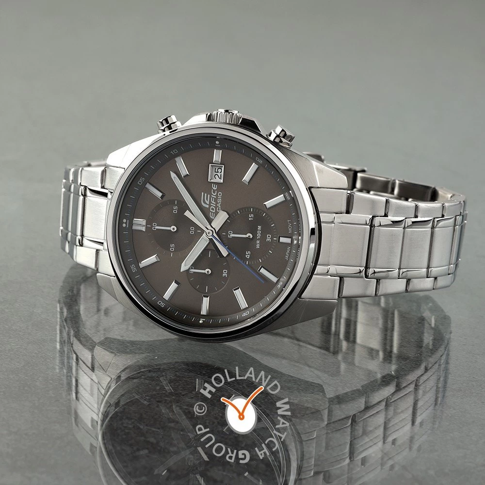 This Casio Edifice watch has a case made of stainless steel with a diameter of 44 mm and is fitted with a metal band. Inside the case lies a Casio movement and the watch features a Mineral crystal.