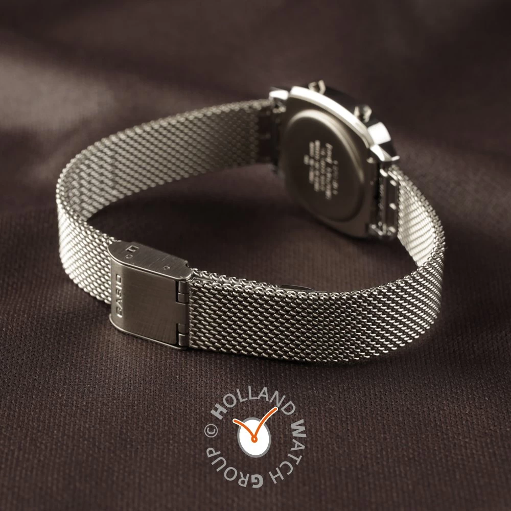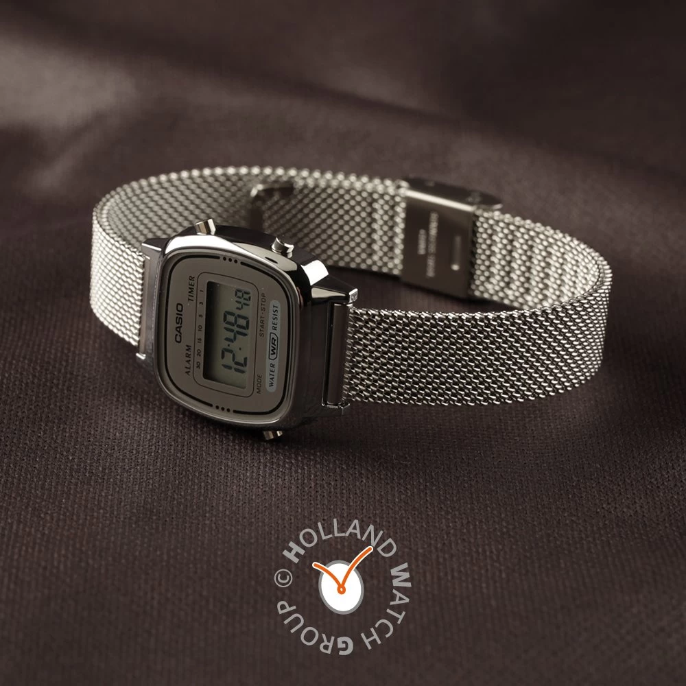 This Casio watch has a case made of plastic with a diameter of 24.6 mm and is fitted with a metal band. Inside the case lies a Casio movement and the watch features a Plexi crystal.