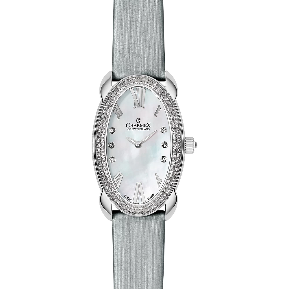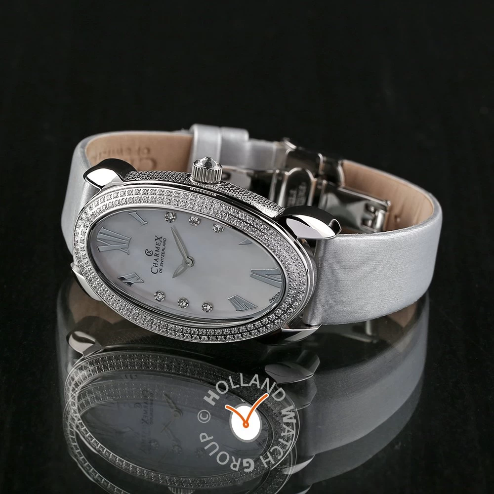 This Charmex of Switzerland watch has a case made of stainless steel with a diameter of 28 mm and is fitted with a leather band. Inside the case lies a Ronda movement and the watch features a Sapphire crystal.