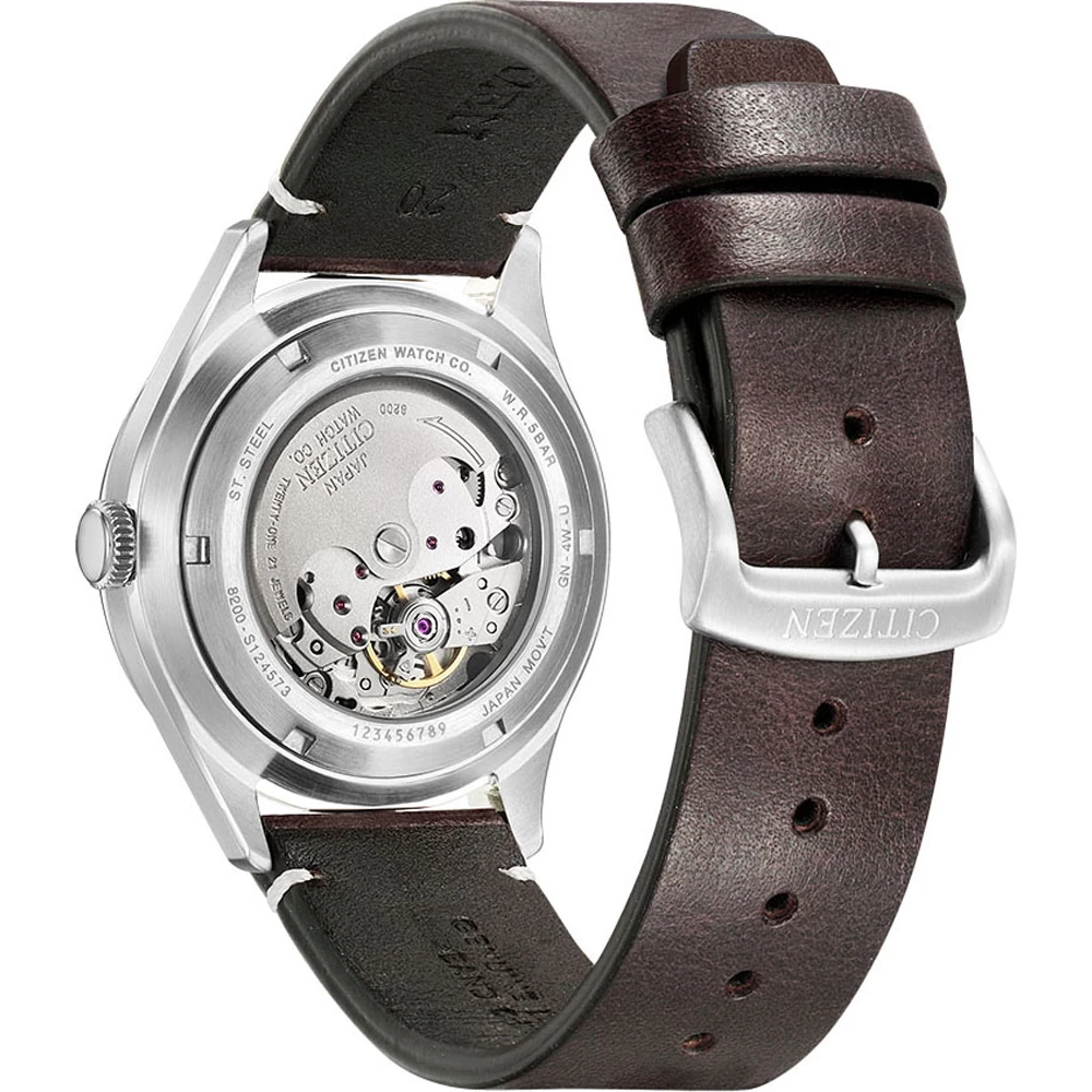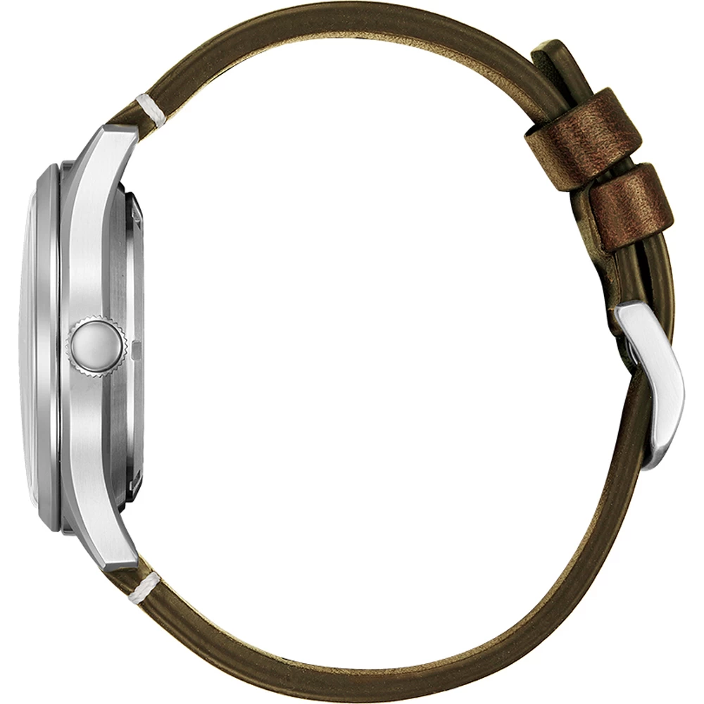 This Citizen watch has a case made of stainless steel with a diameter of 40.2 mm and is fitted with a leather band. Inside the case lies a Miyota movement and the watch features a Mineral crystal.