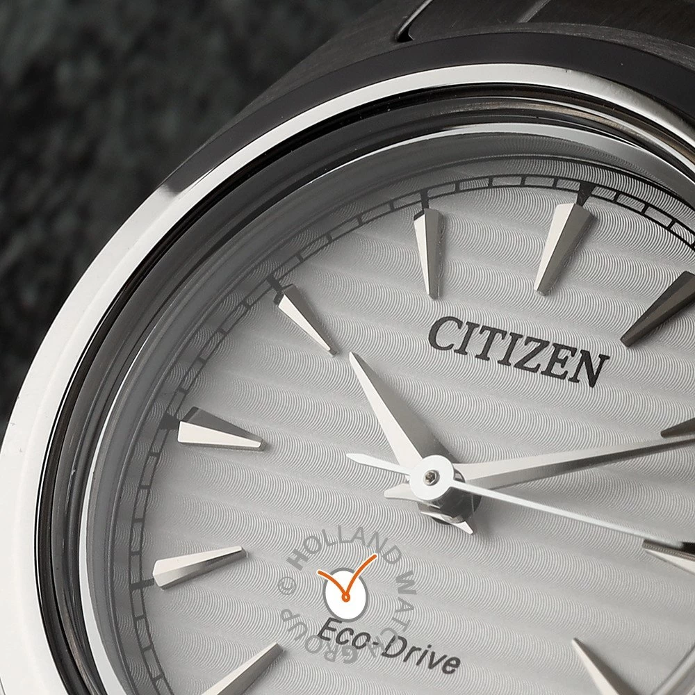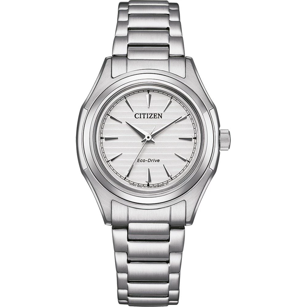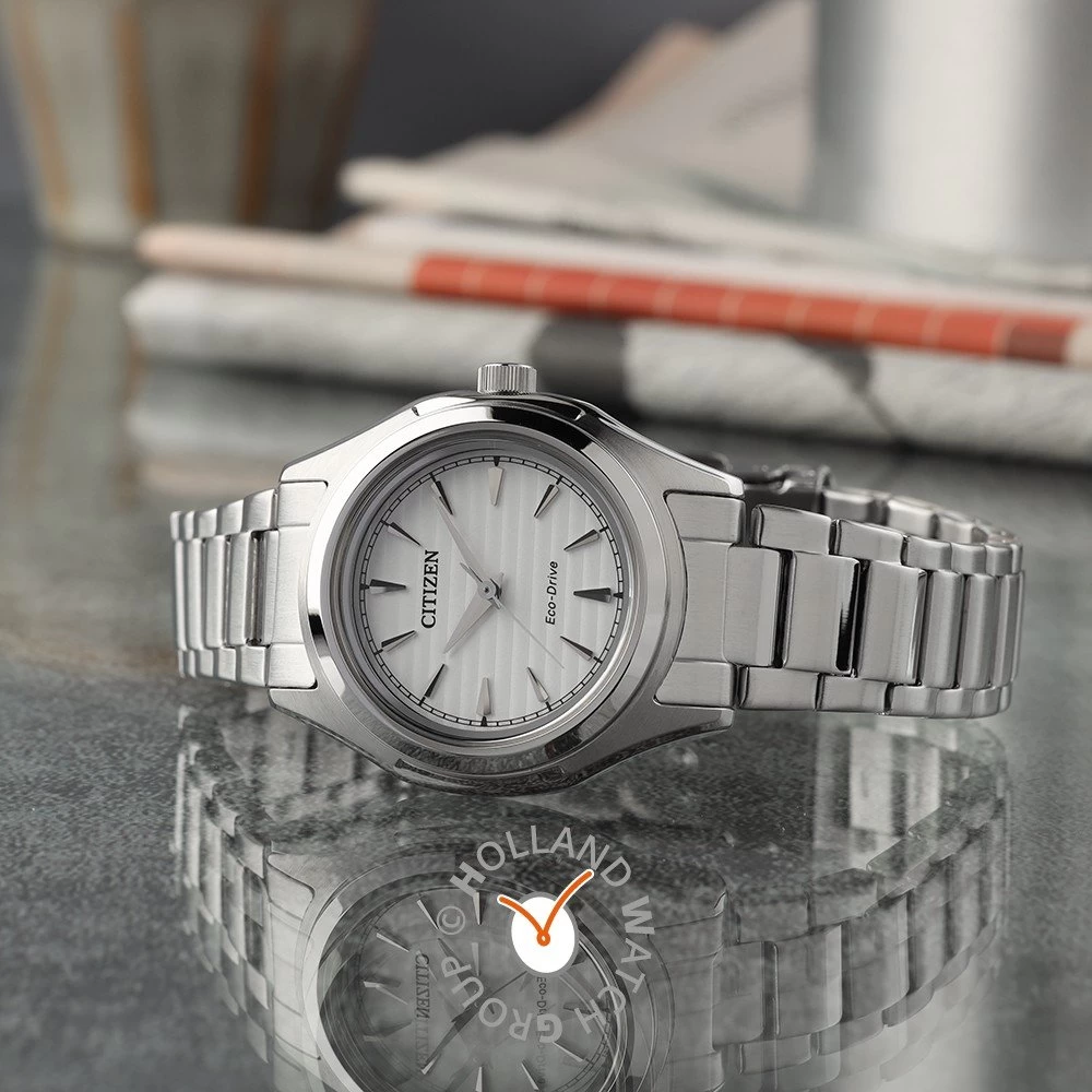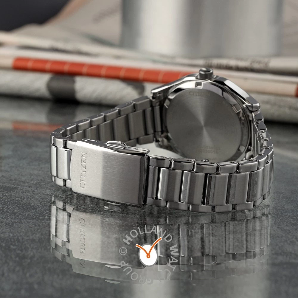 This Citizen watch has a case made of stainless steel with a diameter of 31.3 mm and is fitted with a metal band. Inside the case lies a Citizen movement and the watch features a Mineral crystal.