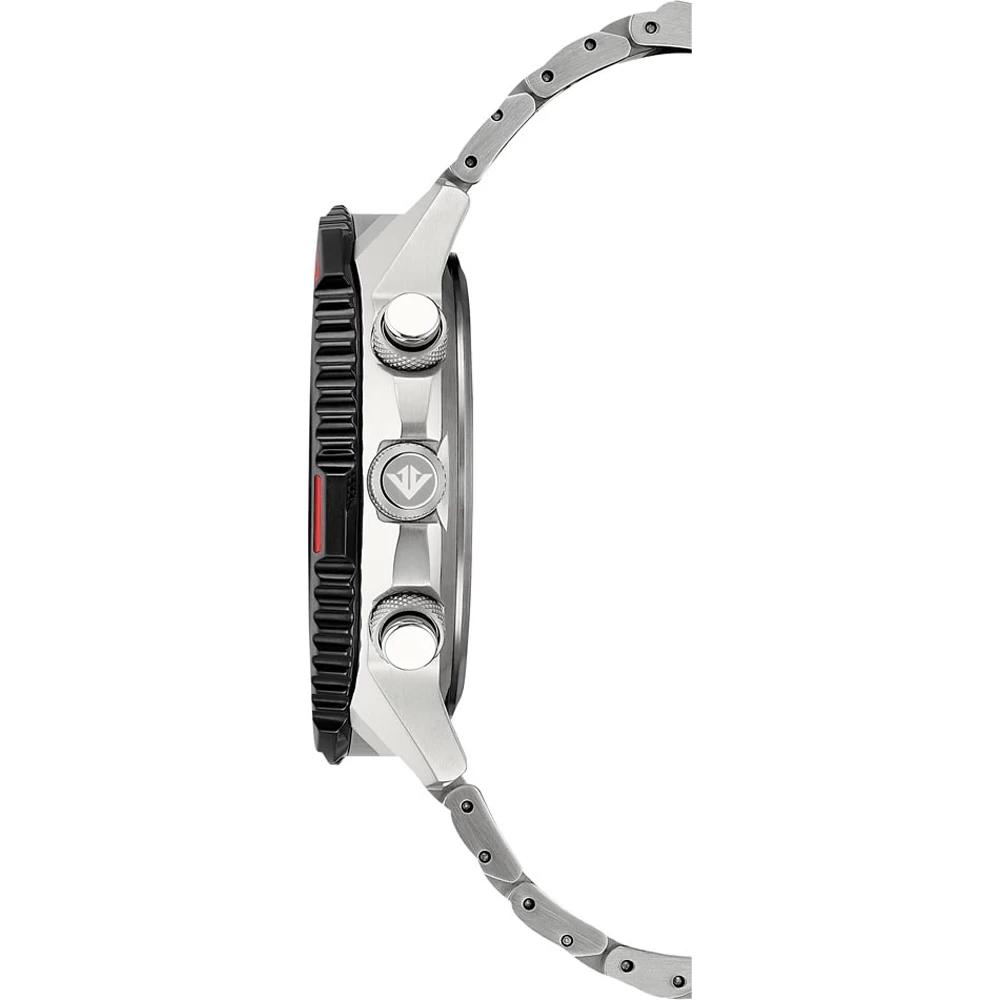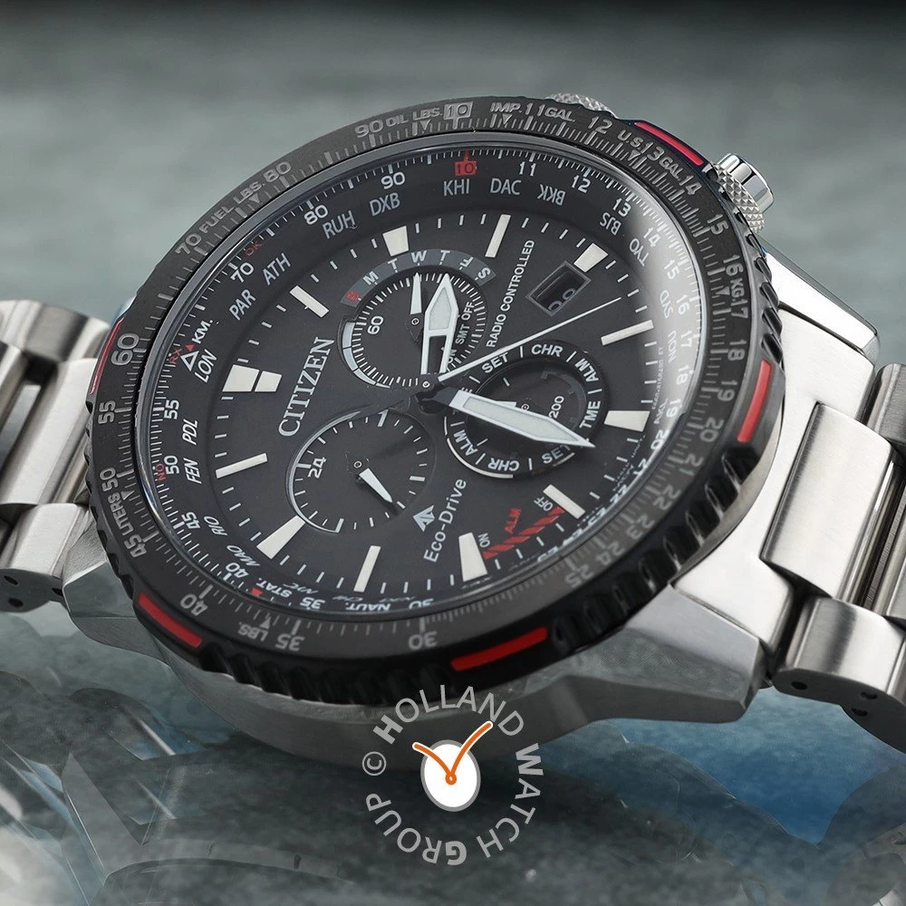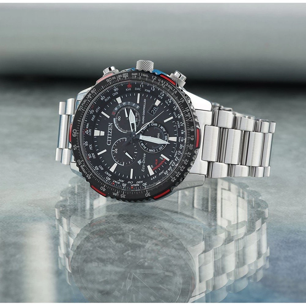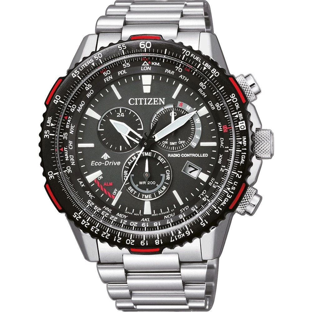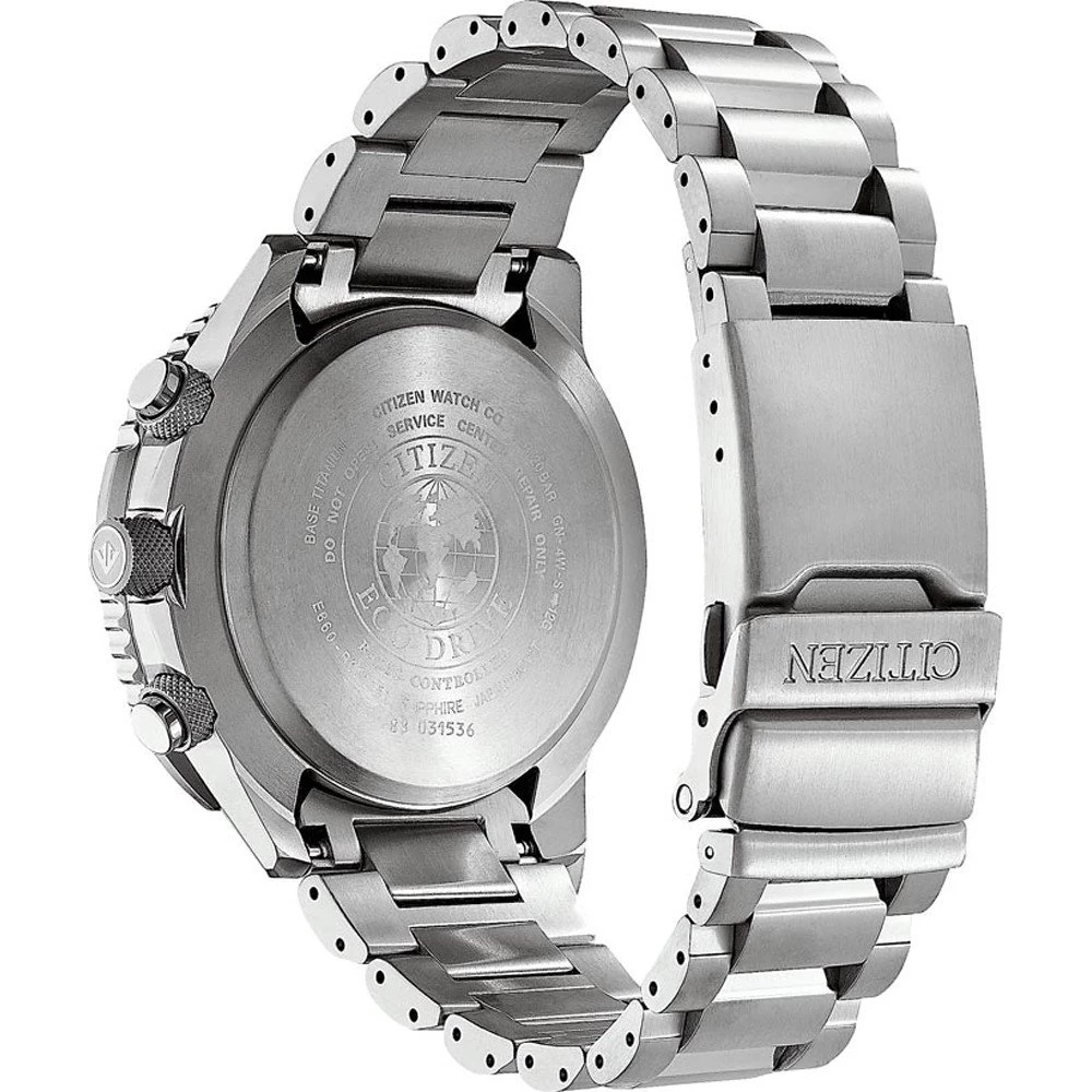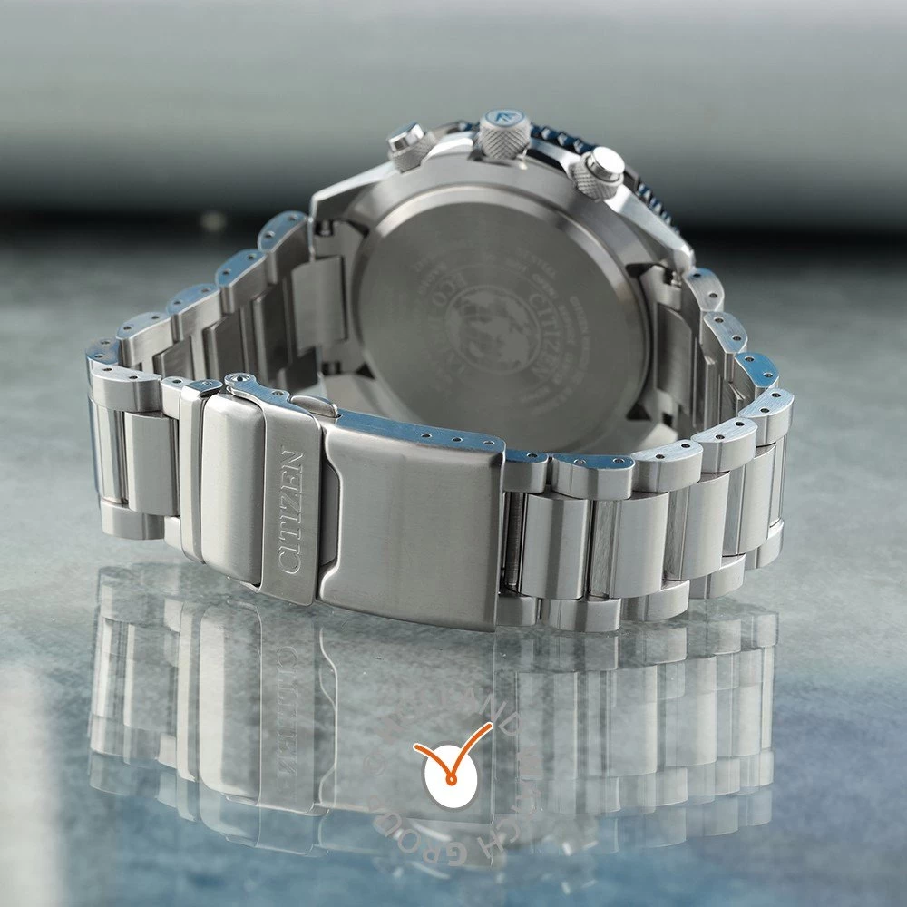 This Citizen watch has a stainless steel case 47 mm in diameter and is fitted with a metal strap. Inside the case lies a Citizen movement and the watch features a Sapphire crystal.
