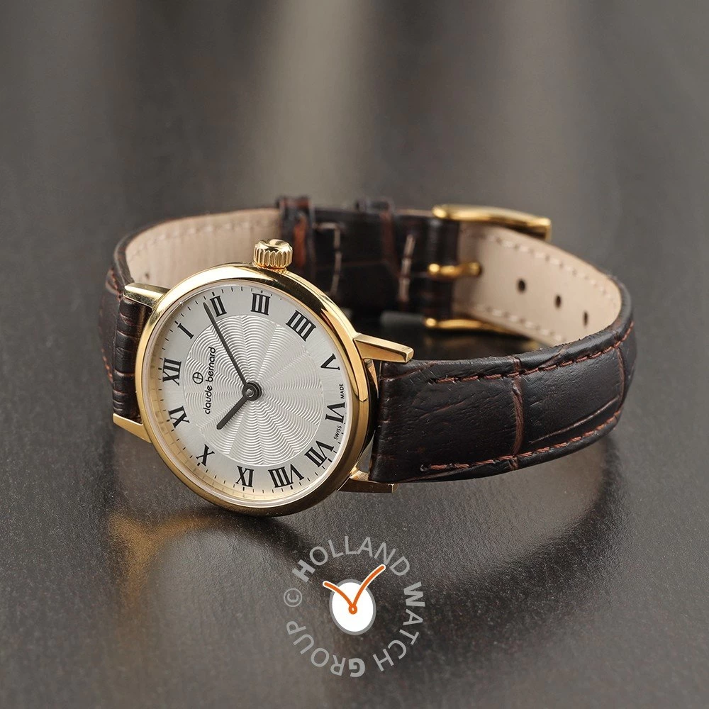 This Claude Bernard watch has a case made of stainless steel with a diameter of 27 mm and is fitted with a leather band. Inside the case lies a Ronda movement and the watch features a Sapphire crystal.