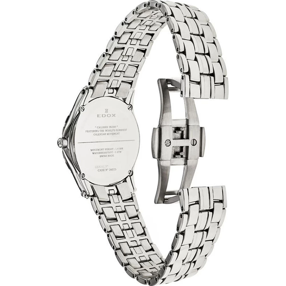 This Edox watch has a case made of stainless steel with a diameter of 33 mm and is fitted with a metal band. Inside the case lies a Edox movement and the watch features a Sapphire crystal.