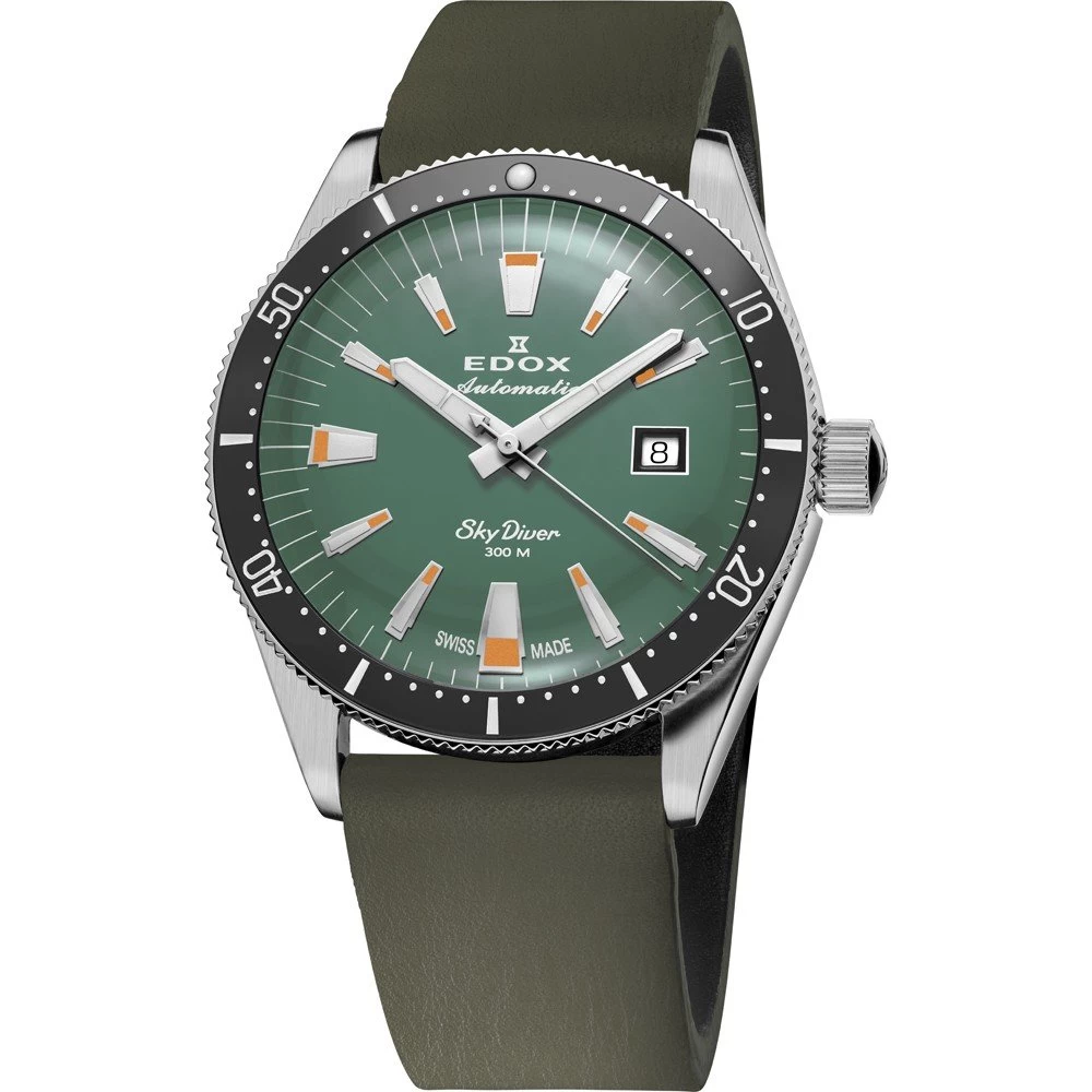 This Edox watch has a stainless steel case 42 mm in diameter and is fitted with a leather strap. Inside the case lies a Sellita movement and the watch features a Sapphire crystal.