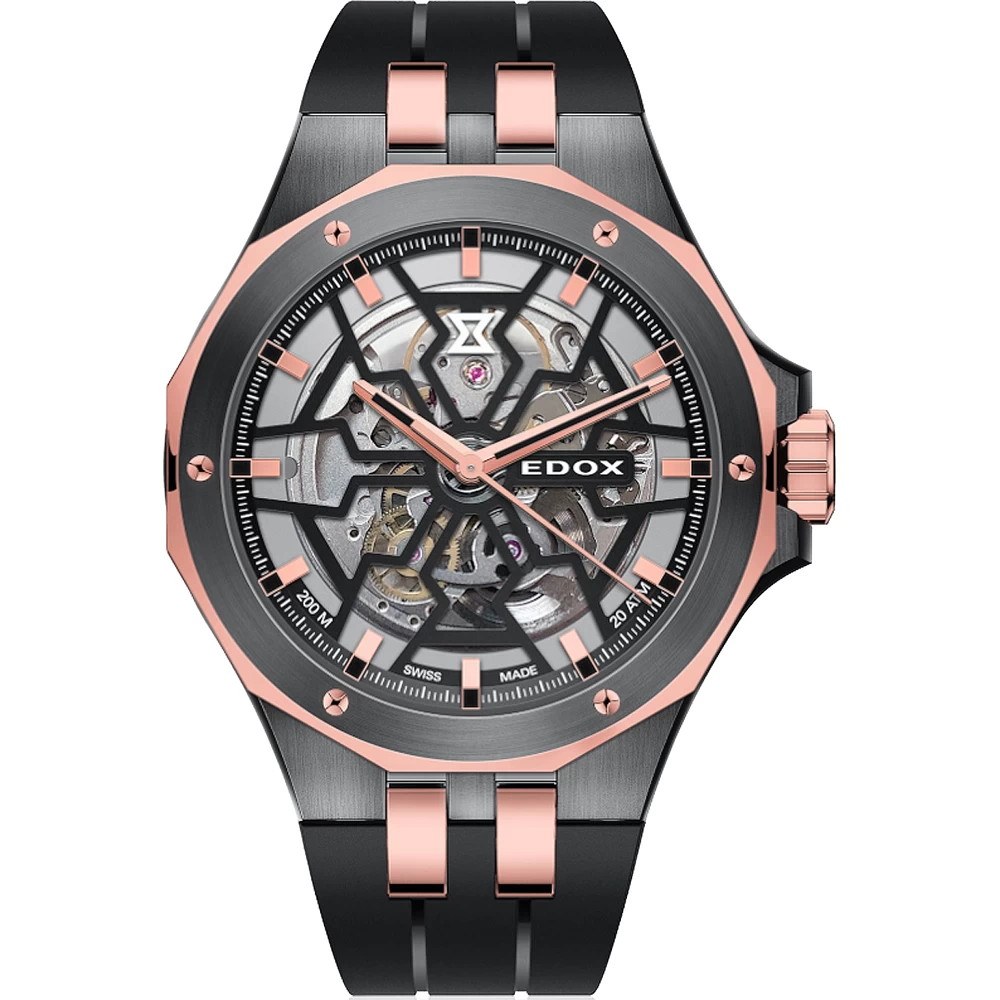 This Edox watch has a stainless steel case 43 mm in diameter and is fitted with a rubber strap. Inside the case lies a Sellita movement and the watch features a Sapphire crystal.
