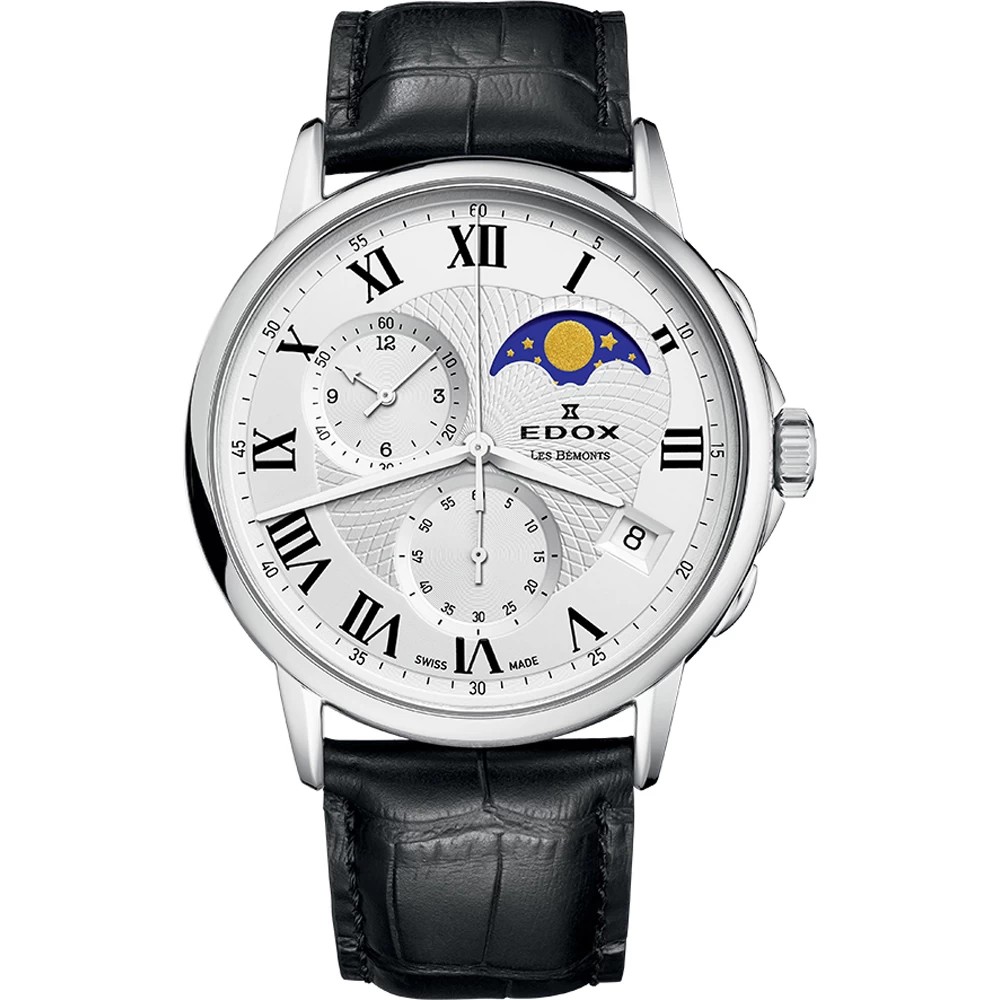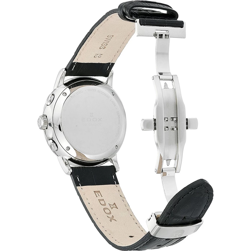 This Edox watch has a case made of stainless steel with a diameter of 42 mm and is fitted with a leather band. Inside the case lies a ETA movement and the watch features a Sapphire crystal.