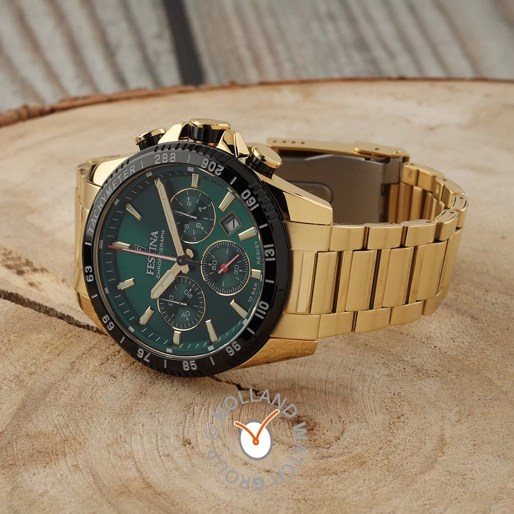 This Festina watch has a case made of stainless steel with a diameter of 45 mm and is fitted with a metal band. Inside the case lies a Miyota movement and the watch features a Mineral crystal.