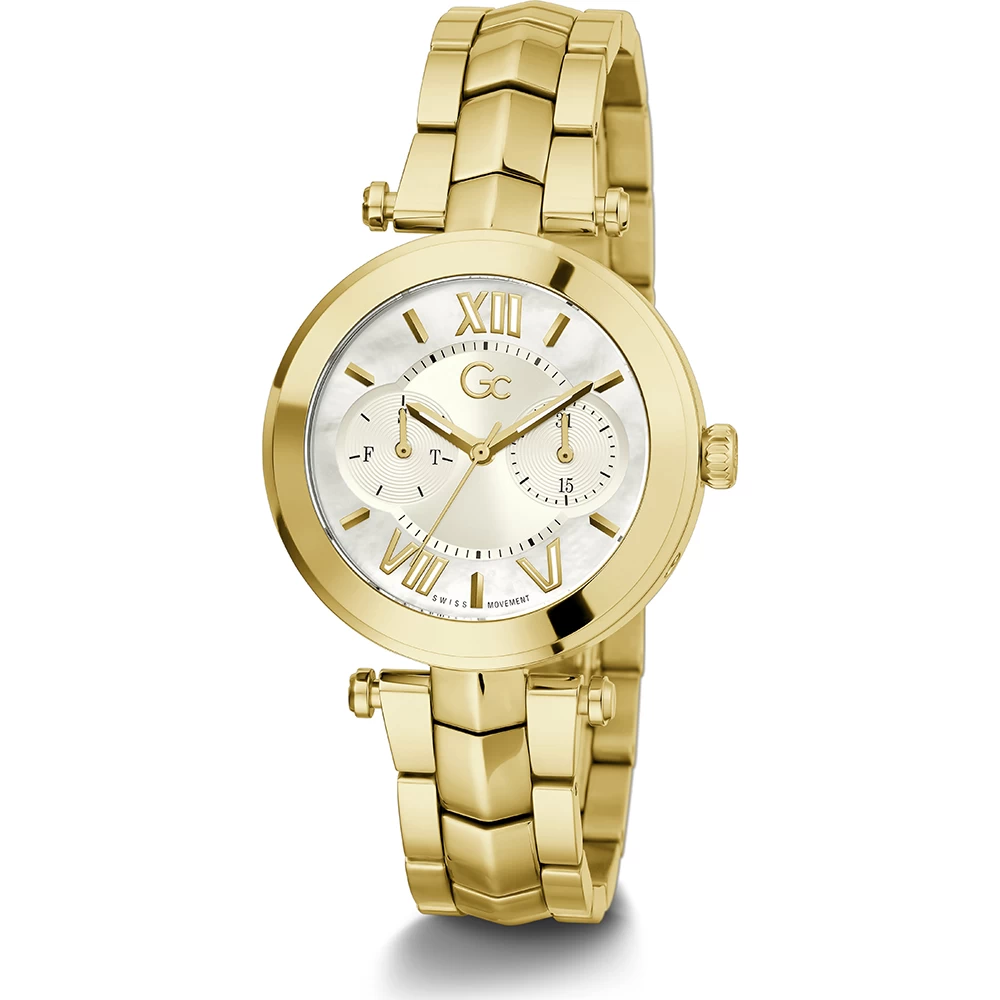 This GC watch has a case made of stainless steel with a diameter of 36.5 mm and is fitted with a metal band.
