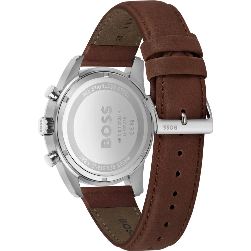 This Hugo Boss watch has a case made of stainless steel with a diameter of 44 mm and is fitted with a leather band. Inside the case lies a Seiko Instruments Inc. movement and the watch features a Mineral crystal.