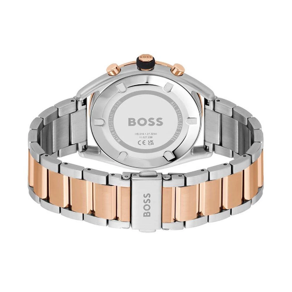 This Hugo Boss watch has a case made of stainless steel with a diameter of 44 mm and is fitted with a metal band. Inside the case lies a Miyota movement and the watch features a Mineral crystal.