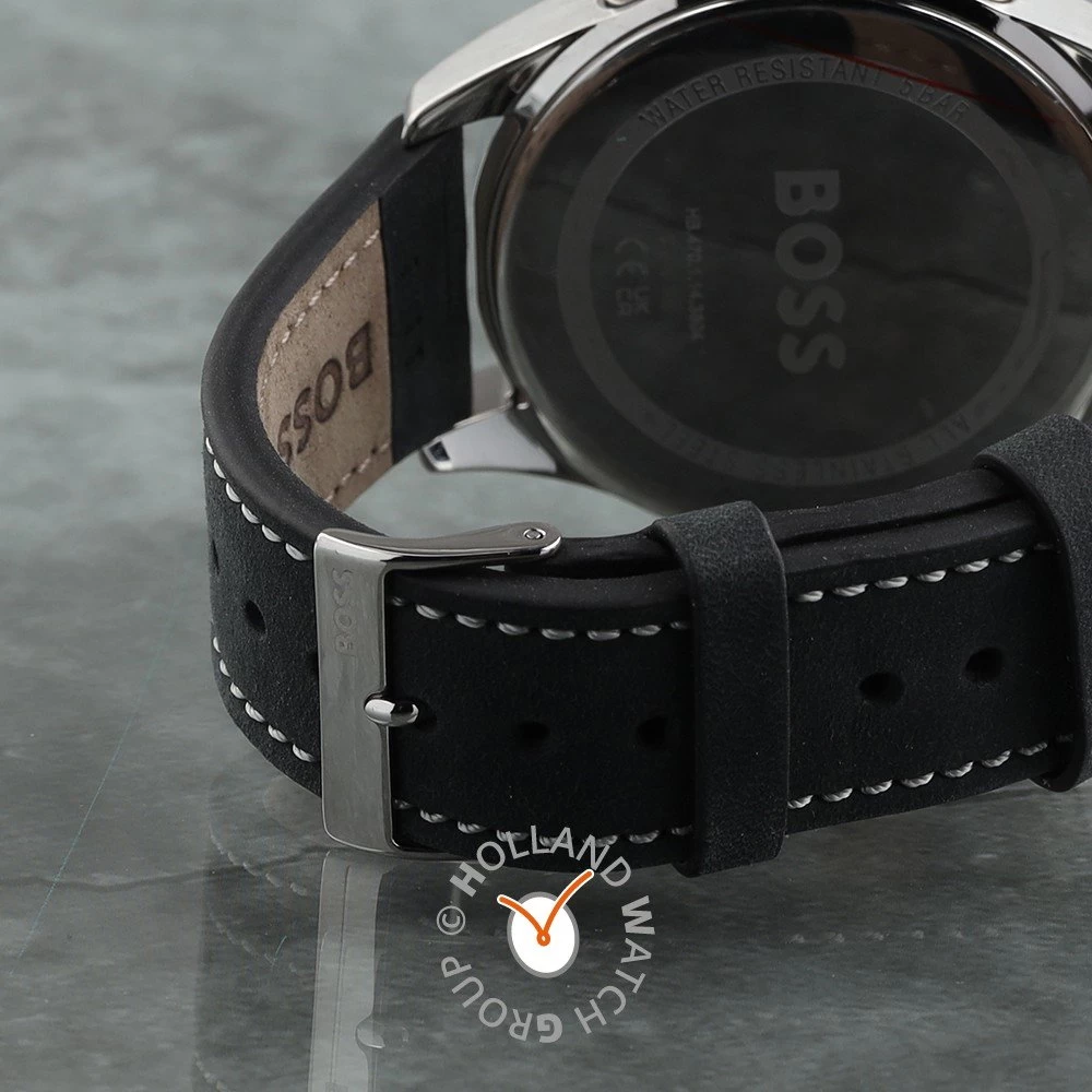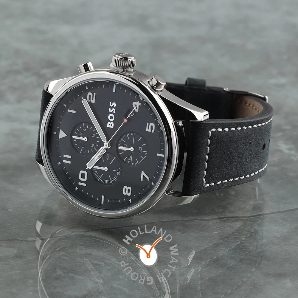 This Hugo Boss watch has a case made of stainless steel with a diameter of 44 mm and is fitted with a leather band. Inside the case lies a Seiko Instruments Inc. movement and the watch features a Mineral crystal.