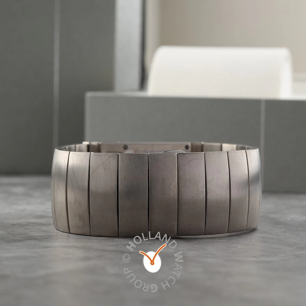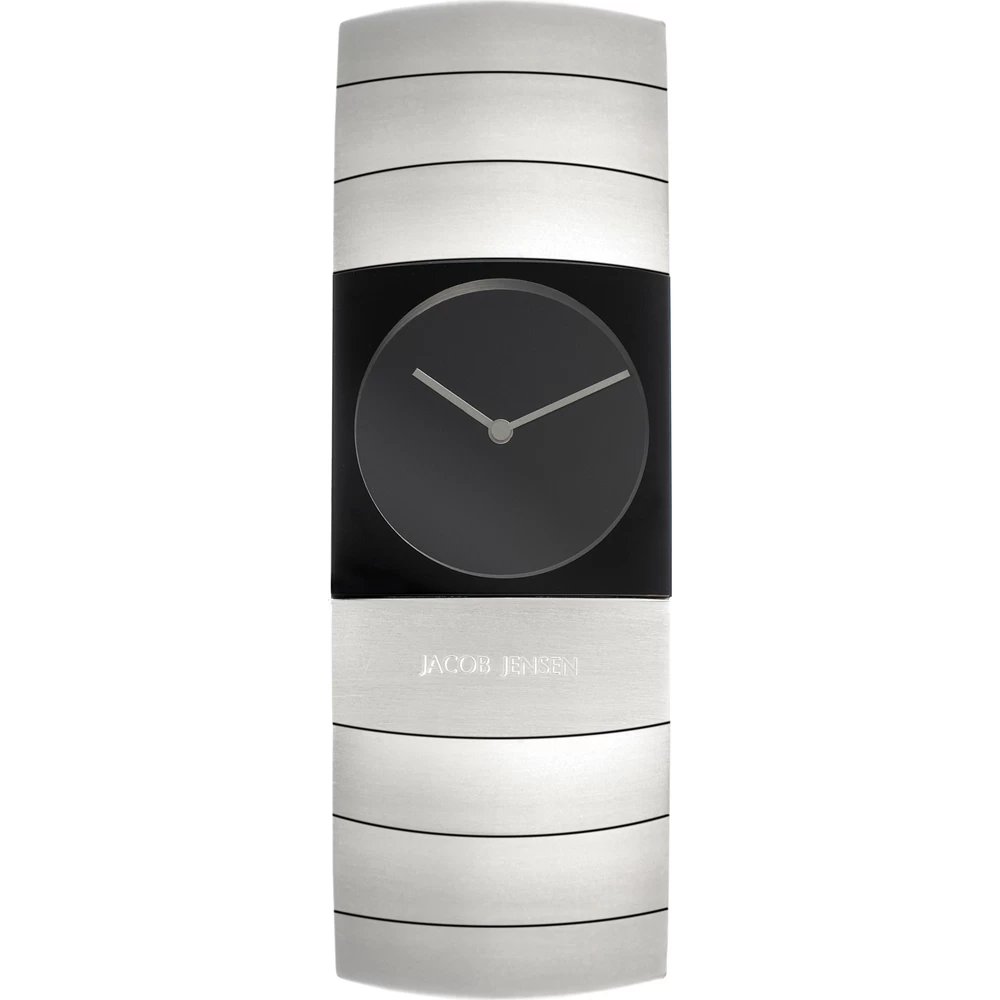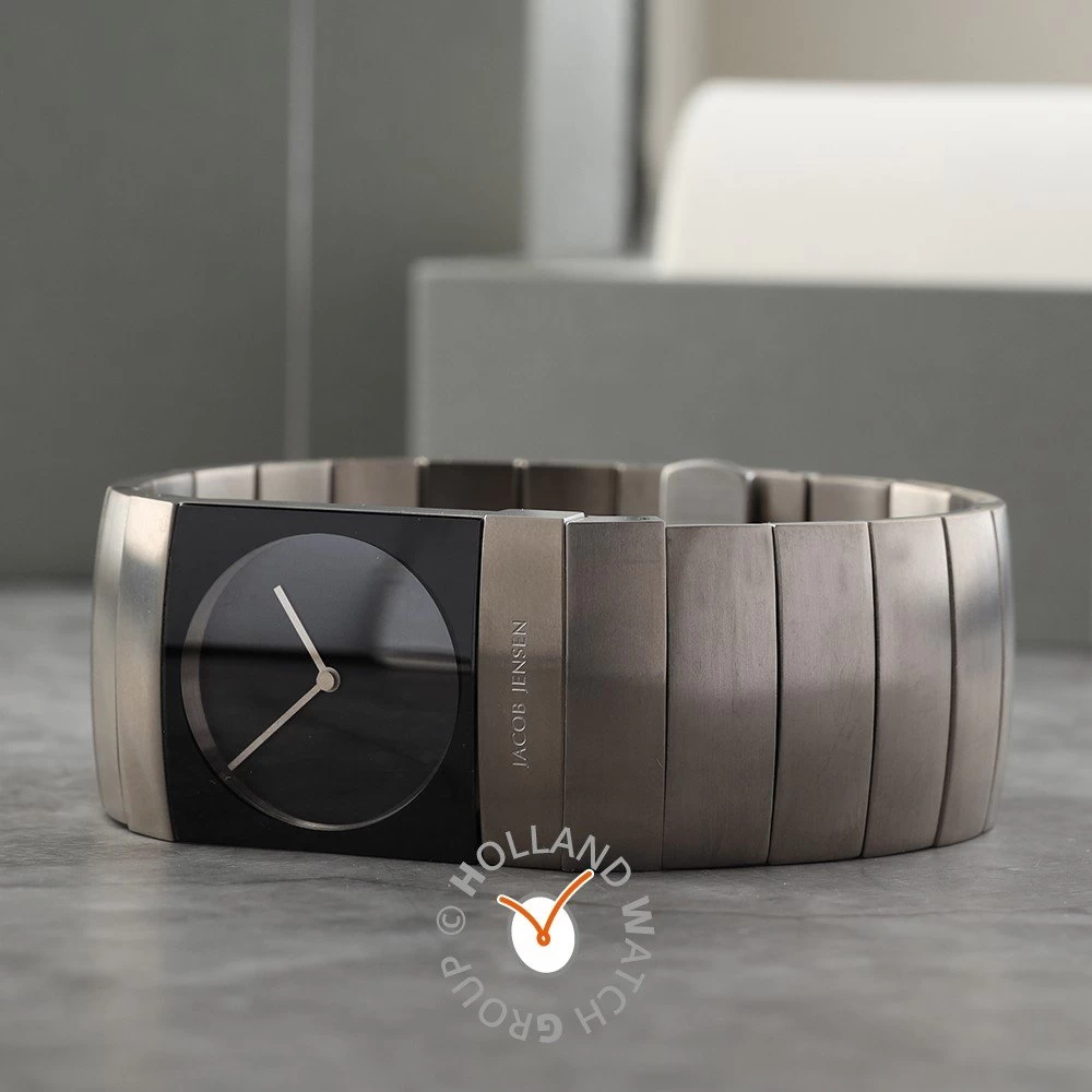 This Jacob Jensen watch has a case made of titanium with a diameter of 22 mm and is fitted with a metal band. Inside the case lies a Ronda movement and the watch features a Sapphire crystal.