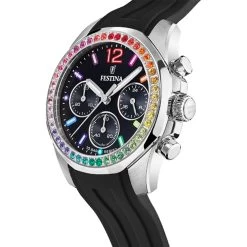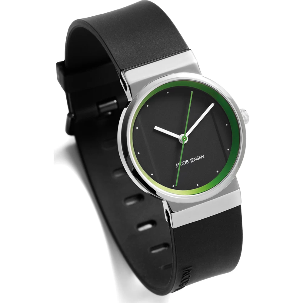 This Jacob Jensen watch has a case made of stainless steel with a diameter of 29 mm and is fitted with a rubber band. Inside the case lies a Ronda movement and the watch features a Mineral crystal.