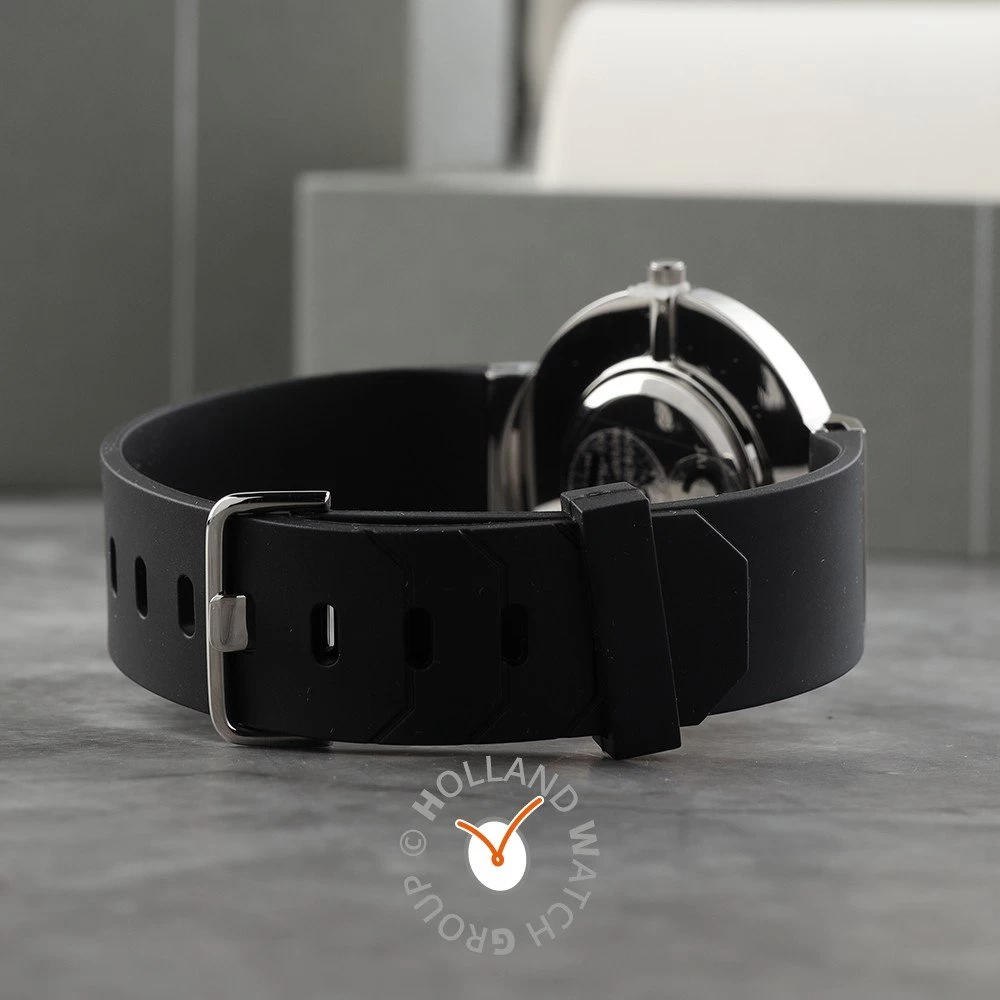This Jacob Jensen watch has a case made of stainless steel with a diameter of 39 mm and is fitted with a rubber band. Inside the case lies a Ronda movement and the watch features a Mineral crystal.