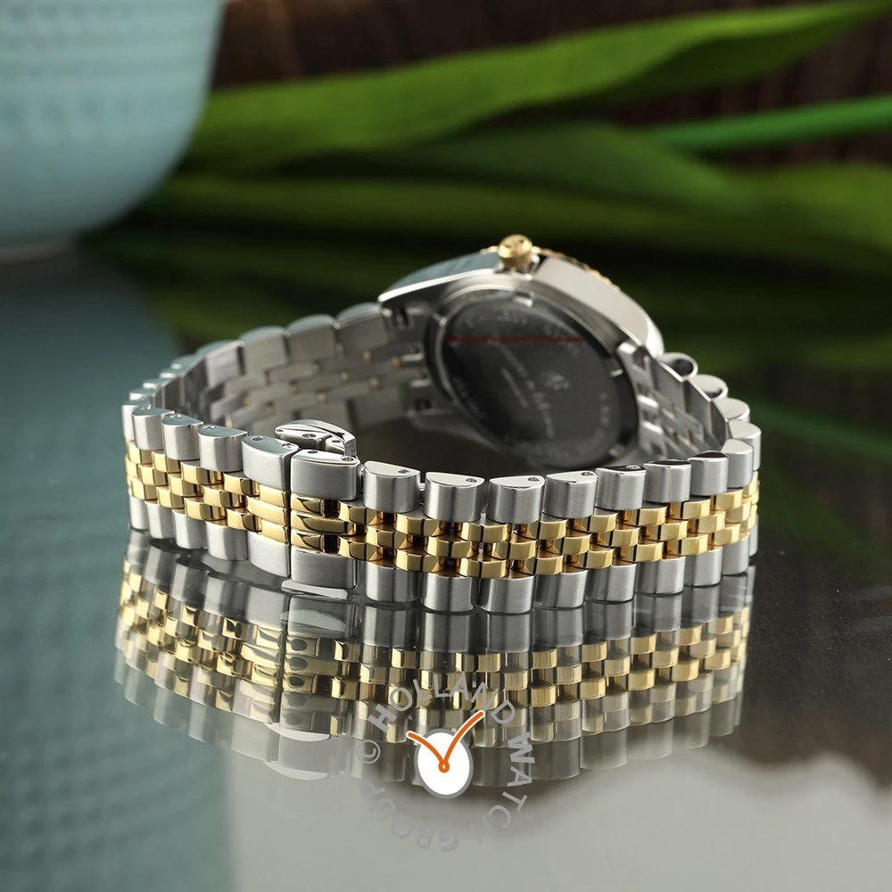 This Jacques du Manoir watch has a case made of stainless steel with a diameter of 31 mm and is fitted with a metal band. Inside the case lies a Ronda movement and the watch features a Mineral crystal.