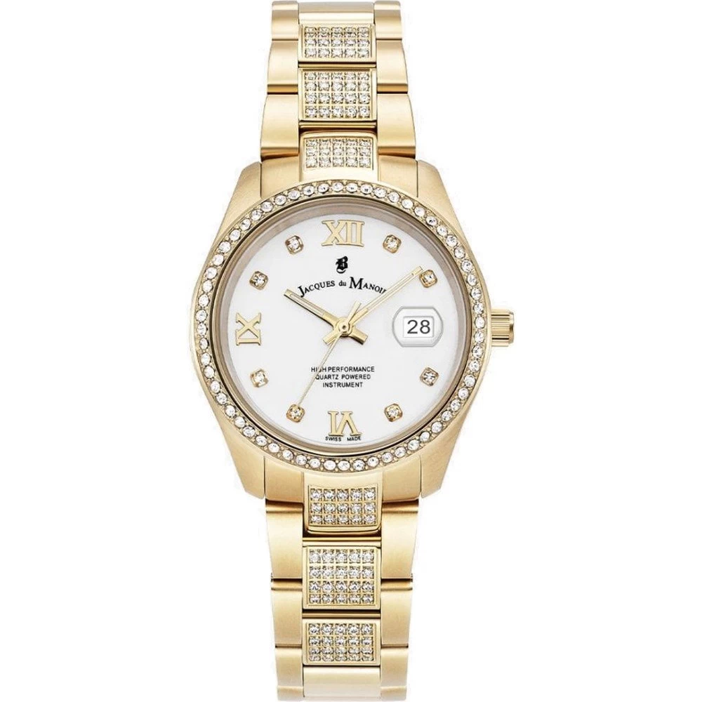 This Jacques du Manoir watch has a case made of stainless steel with a diameter of 31 mm and is fitted with a metal band. Inside the case lies a Ronda movement and the watch features a Mineral crystal.