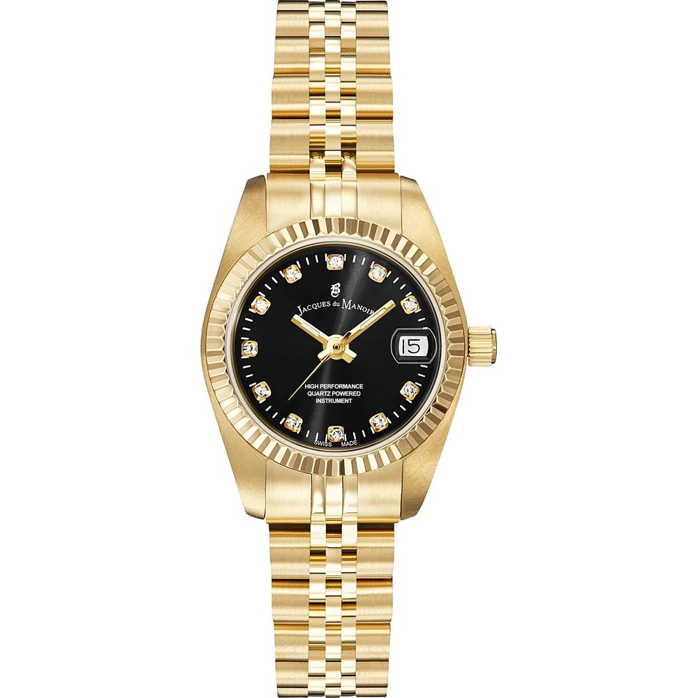 This Jacques du Manoir watch has a case made of stainless steel with a diameter of 26 mm and is fitted with a metal band.