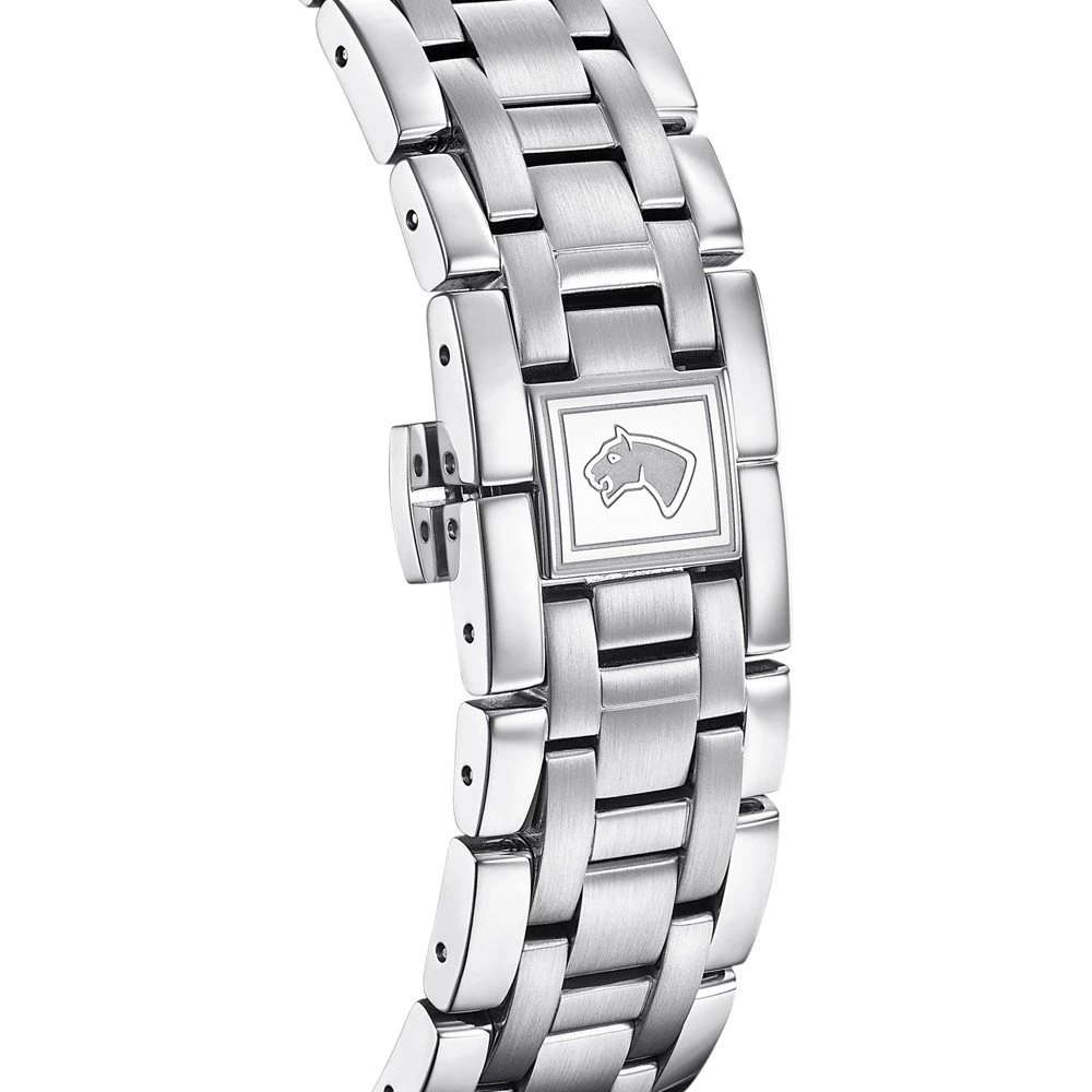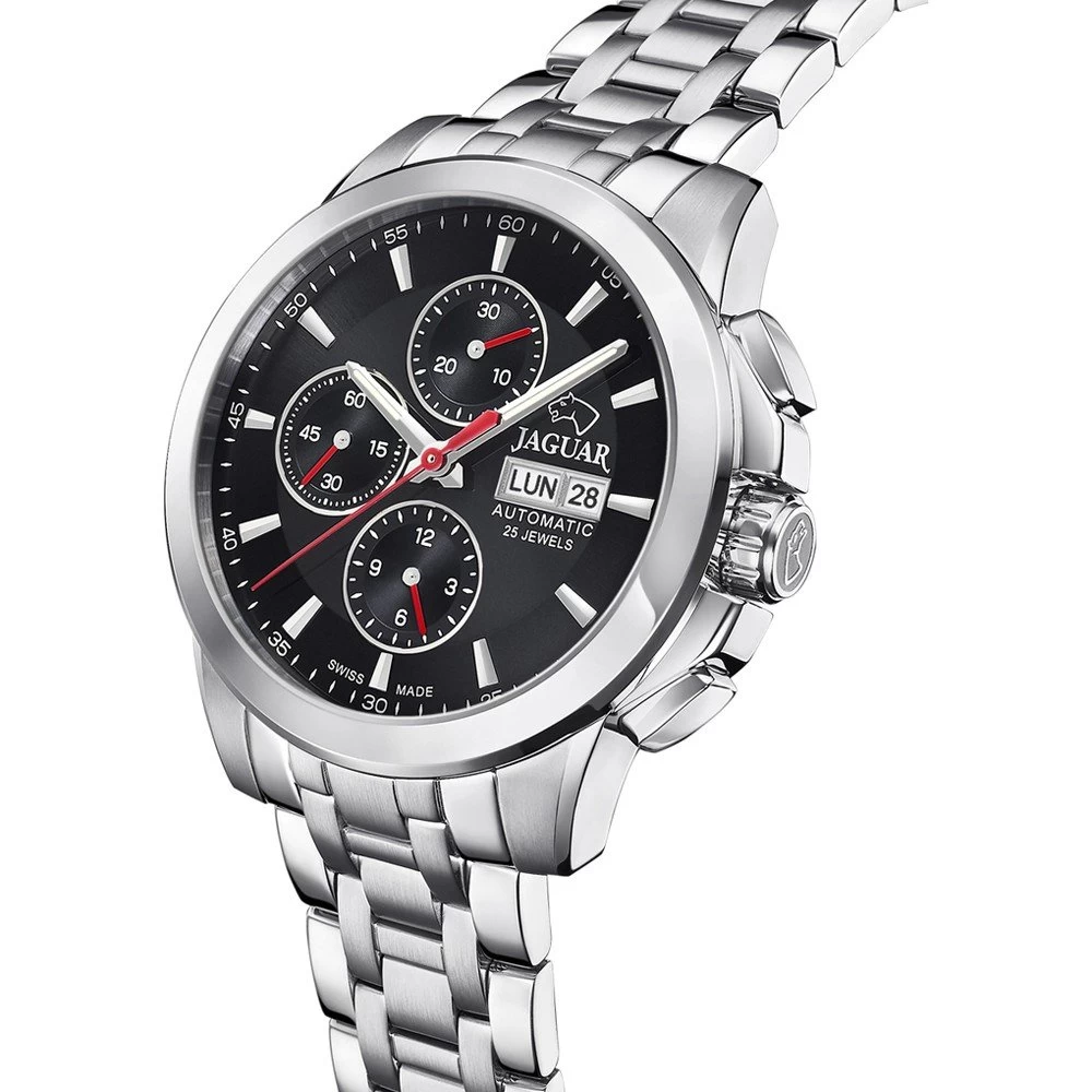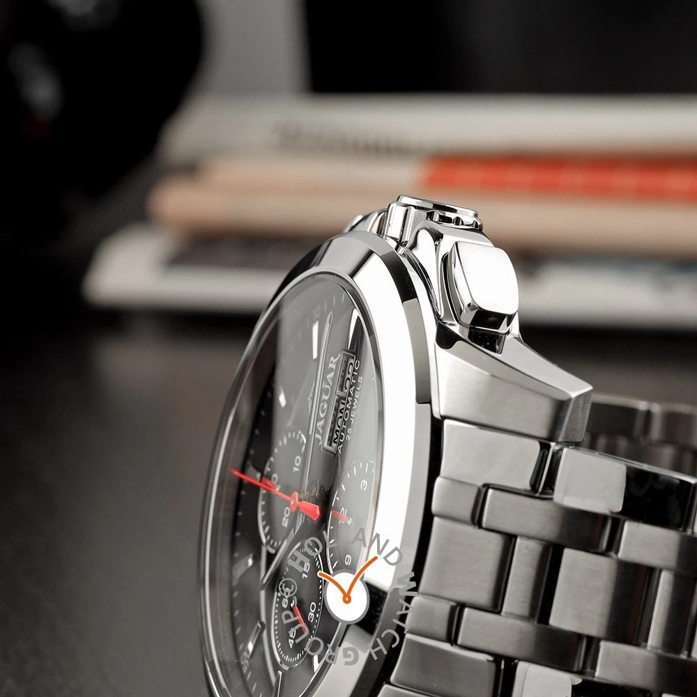 This Jaguar watch has a case made of stainless steel with a diameter of 45 mm and is fitted with a metal band. Inside the case lies a ETA movement and the watch features a Sapphire crystal.