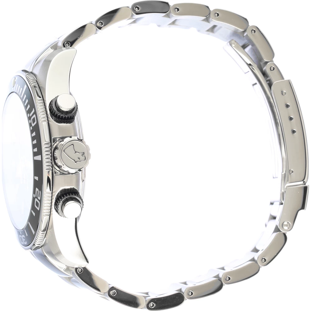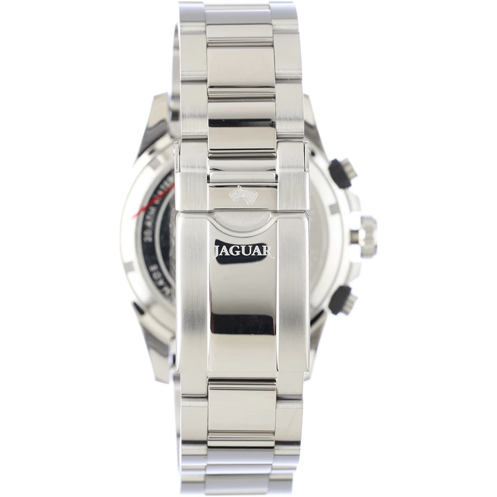 This Jaguar watch has a stainless steel case 43 mm in diameter and is fitted with a metal strap. Inside the case lies a Ronda movement and the watch features a Sapphire crystal.