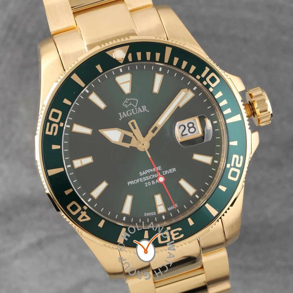 This Jaguar watch has a stainless steel case 43 mm in diameter and is fitted with a metal strap. Inside the case lies a Ronda movement and the watch features a Sapphire crystal.