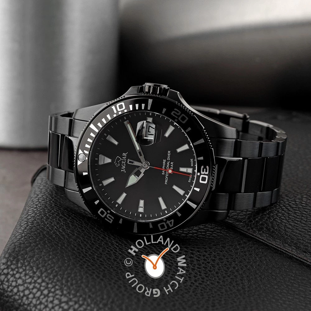 This Jaguar watch has a stainless steel case 43 mm in diameter and is fitted with a metal strap. Inside the case lies a Ronda movement and the watch features a Sapphire crystal.