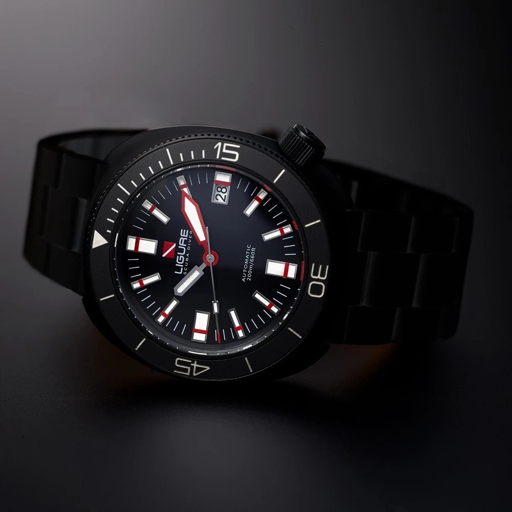 This Ligure watch has a stainless steel case 41 mm in diameter and is fitted with a metal strap. Inside the case lies a Sellita movement and the watch features a Sapphire crystal.
