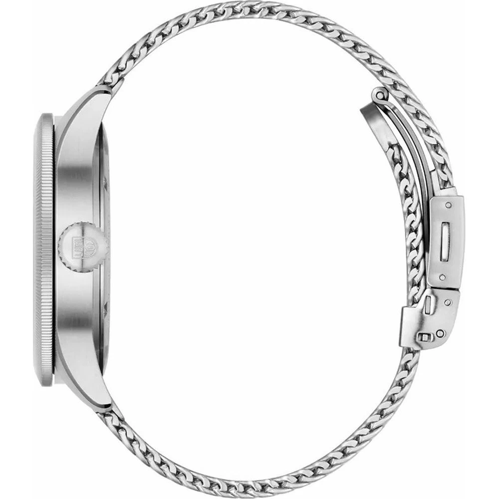 This Luminox watch has a case made of stainless steel with a diameter of 42 mm and is fitted with a metal band. Inside the case lies a Ronda movement and the watch features a Mineral crystal.