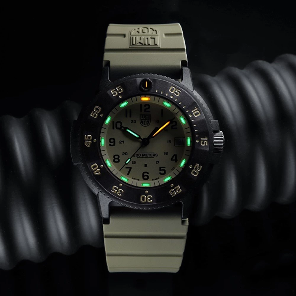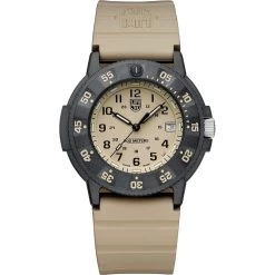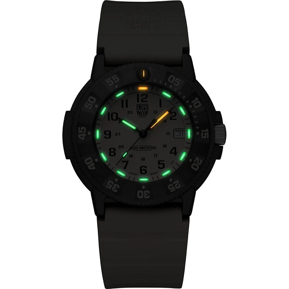 This Luminox watch has a carbon case 43 mm in diameter and is fitted with a rubber strap. Inside the case lies a Ronda movement and the watch features a Hardened mineral crystal.