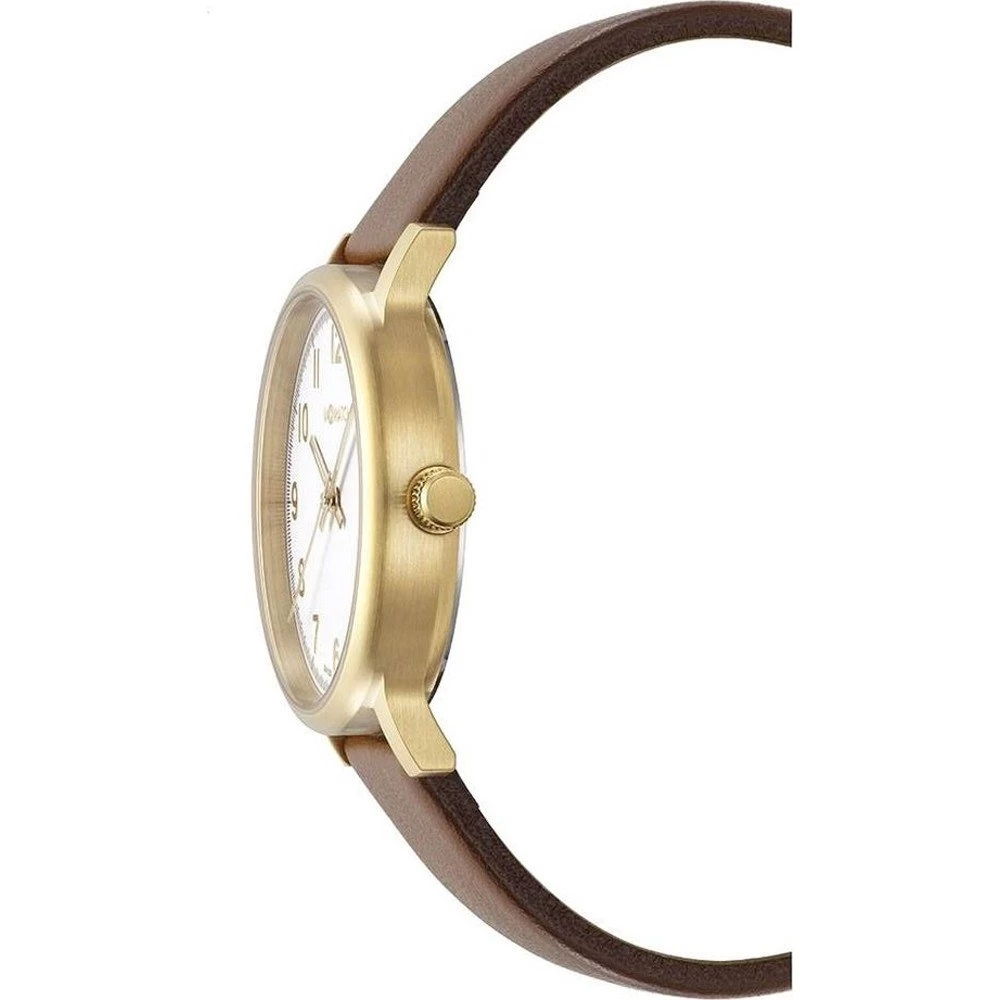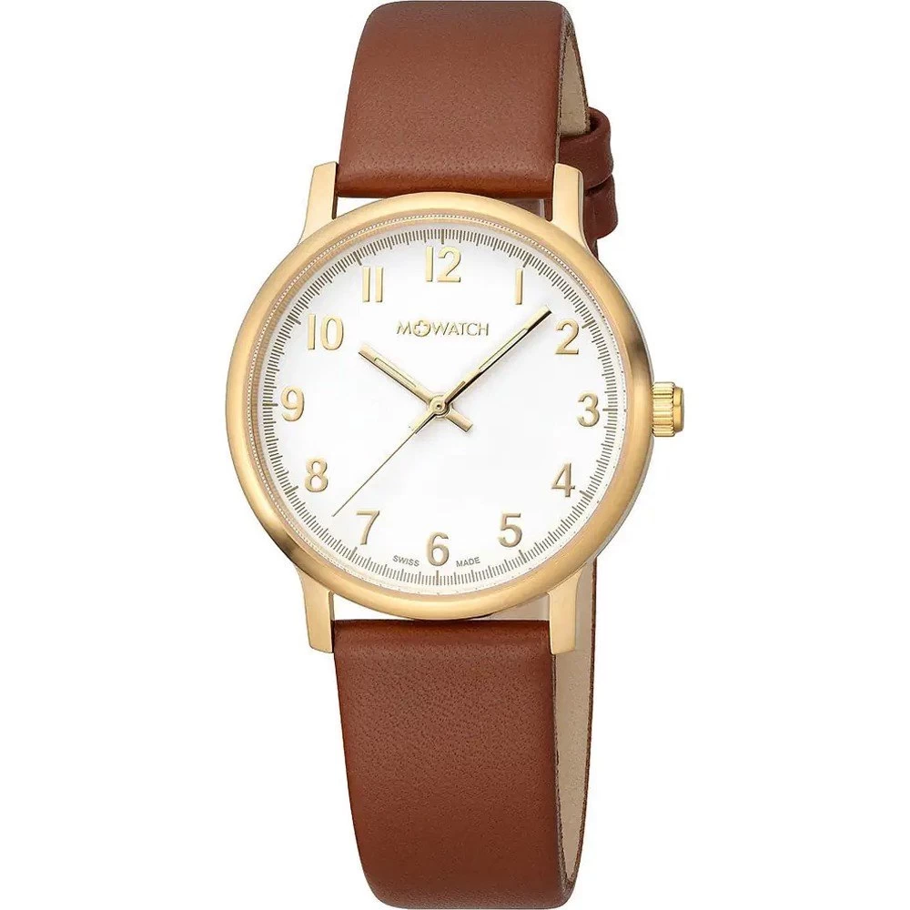 This M-Watch by Mondaine watch has a case made of stainless steel with a diameter of 35 mm and is fitted with a leather band. Inside the case lies a Ronda movement and the watch features a Hardened mineral crystal.