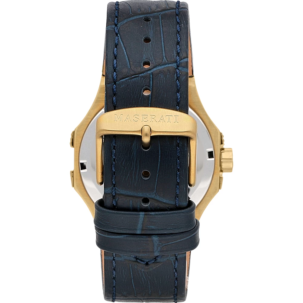 This Maserati watch has a case made of stainless steel with a diameter of 42 mm and is fitted with a leather band. Inside the case lies a Seiko Instruments Inc. movement and the watch features a Mineral crystal.