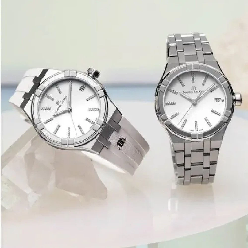 This Maurice Lacroix watch has a case made of stainless steel with a diameter of 35 mm and is fitted with a metal band. Inside the case lies a Ronda movement and the watch features a Sapphire crystal.