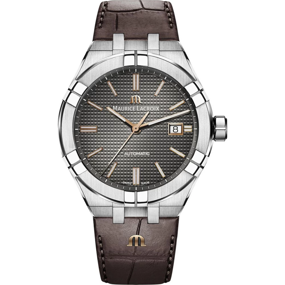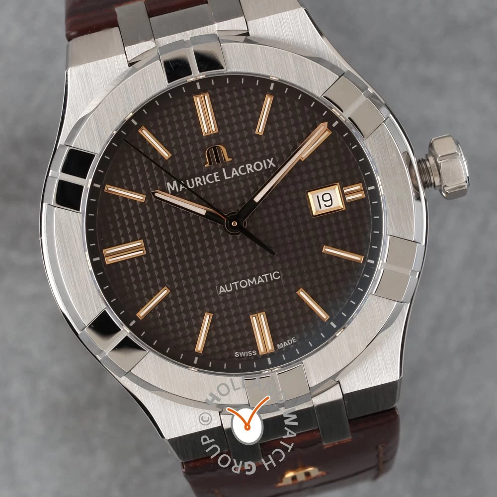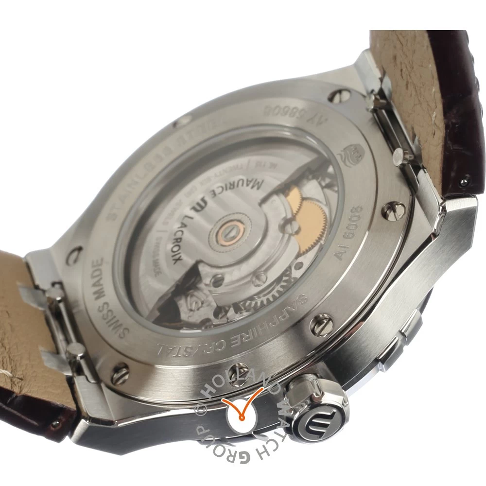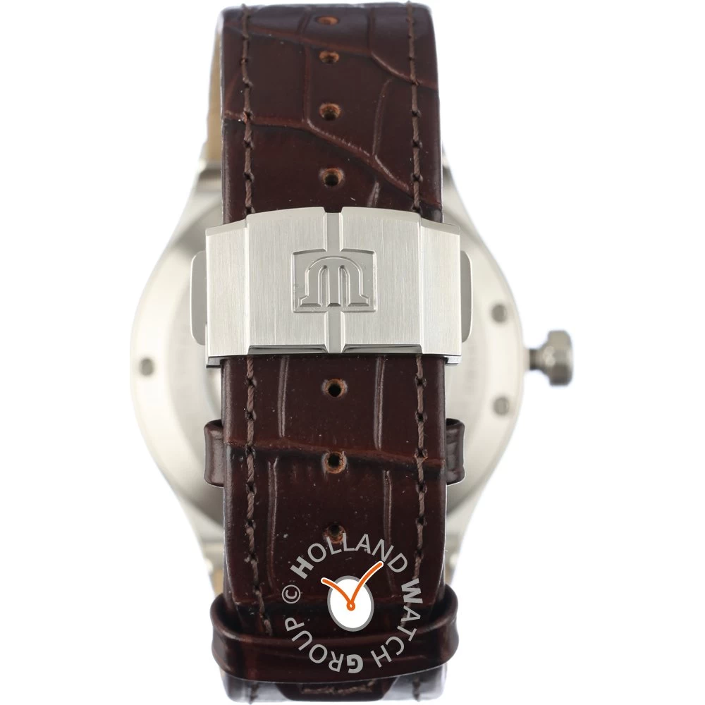 This Maurice Lacroix watch has a case made of stainless steel with a diameter of 42 mm and is fitted with a leather band. Inside the case lies a Sellita movement and the watch features a Sapphire crystal.