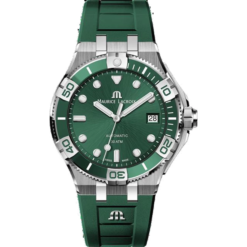 This Maurice Lacroix watch has a stainless steel case 38 mm in diameter and is fitted with a rubber strap. Inside the case lies a Sellita movement and the watch features a Sapphire crystal.