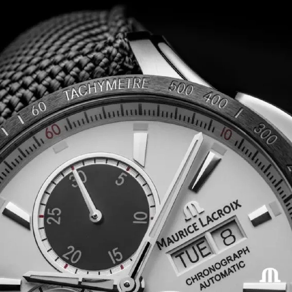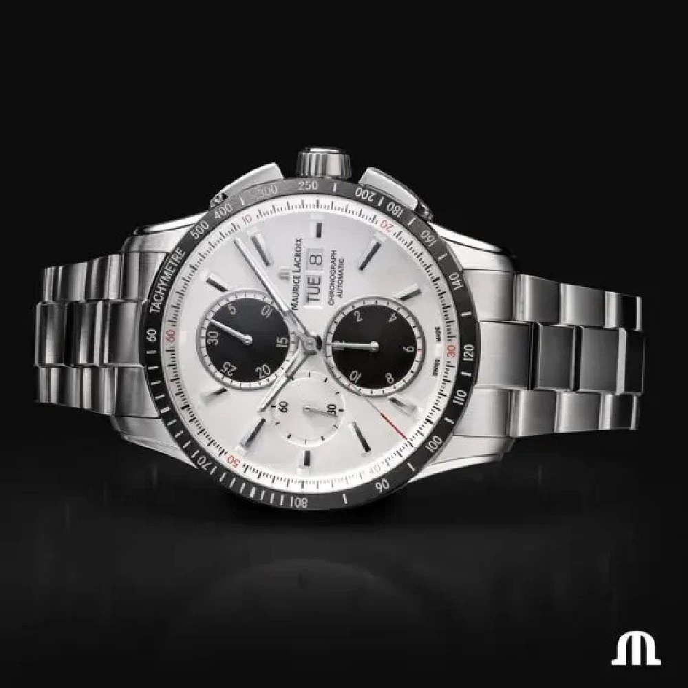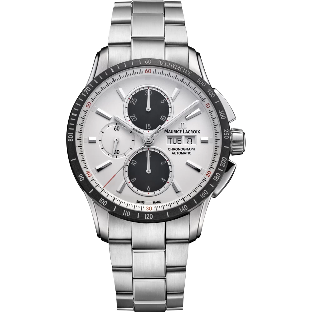 This Maurice Lacroix watch has a case made of stainless steel with a diameter of 43 mm and is fitted with a leather band. Inside the case lies a Sellita movement and the watch features a Sapphire crystal.